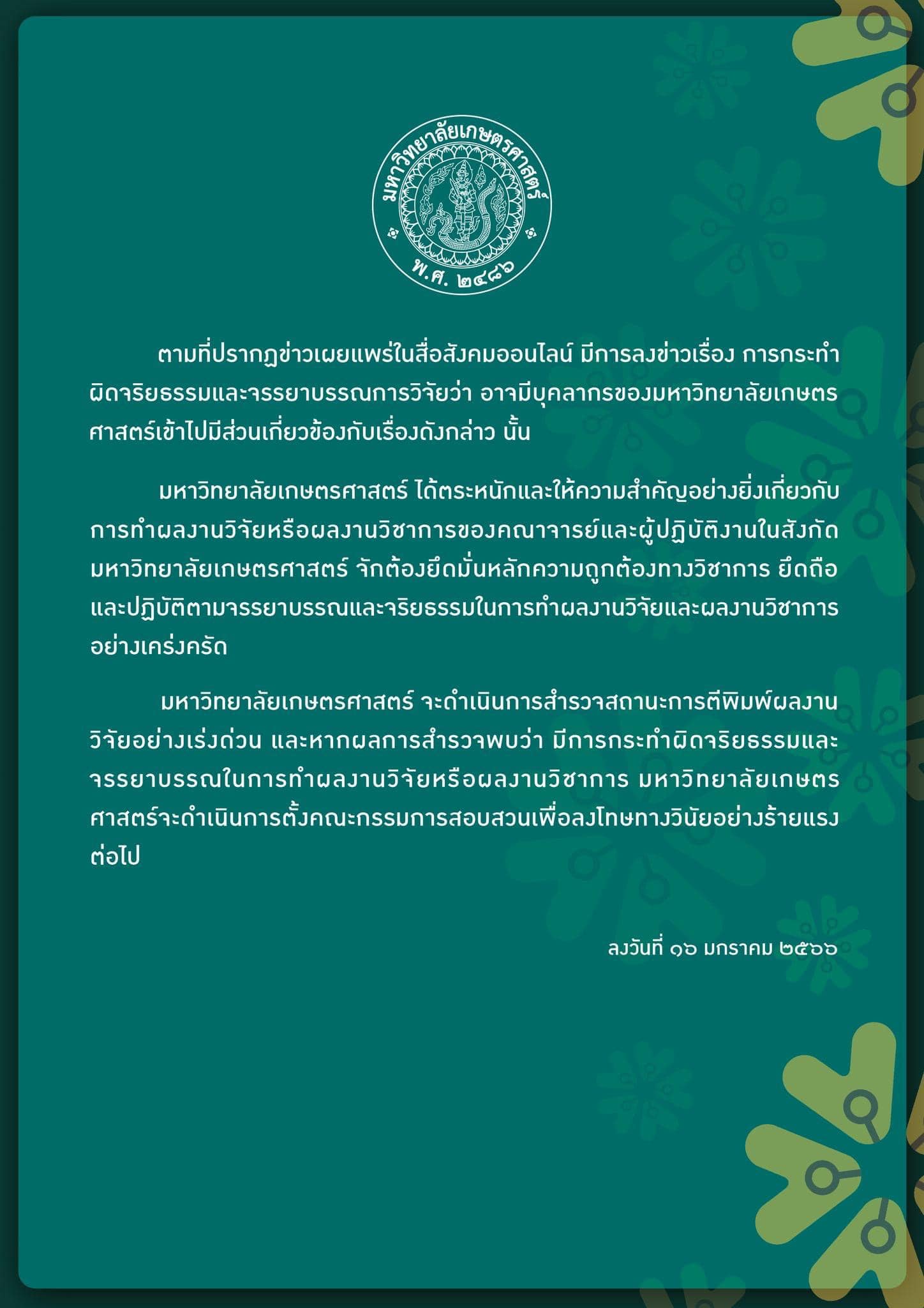 ในวันเดียวกันนี้ มหาวิทยาลัยเกษตรศาสตร์ ได้ออกประกาศ ระบุว่า ตามที่ปรากฎข่าวเผยแพร่ในสื่อสังคมออนไลน์ มีการลงข่าวเรื่อง การกระทำผิดจริยธรรมและจรรยาบรรณการวิจัยว่า อาจมีบุคลากรของมหาวิทยาลัยเกษตรศาสตร์เข้าไปมีส่วนเกี่ยวข้องกับเรื่องดังกล่าว นั้น