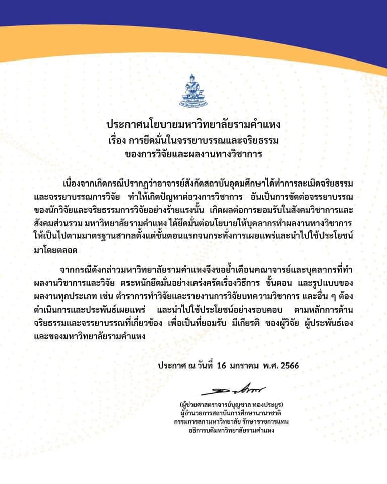 จากกรณีดังกล่าวมหาวิทยาลัยรามคำแหงจึงขอย้ำเตือคณาจารย์และบุคลากรที่ทำผลงานวิซาการและวิจัย ตระหนักยึดมั่นอย่างเคร่งครัดเรื่องวิธีการ ขั้นตอน และรูปแบบของผลงานทุกประเภท เช่น ตำราการทำวิจัยและรายงานการวิจัยบทความวิชาการ และอื่น ๆ ต้องดำเนินการและประพันธ์เผยแพร่ และนำไปใช้ปรโยชน์อย่างรอบคอบ ตามหลักการด้านจริยธรรมและจรรยาบรรณที่เกี่ยวข้อง เพื่อเป็นที่ยอมรับ มีเกียรติ ของผู้วิจัย ผู้ประพันธ์เองและของมหาวิทยาลัยรามคำแหง