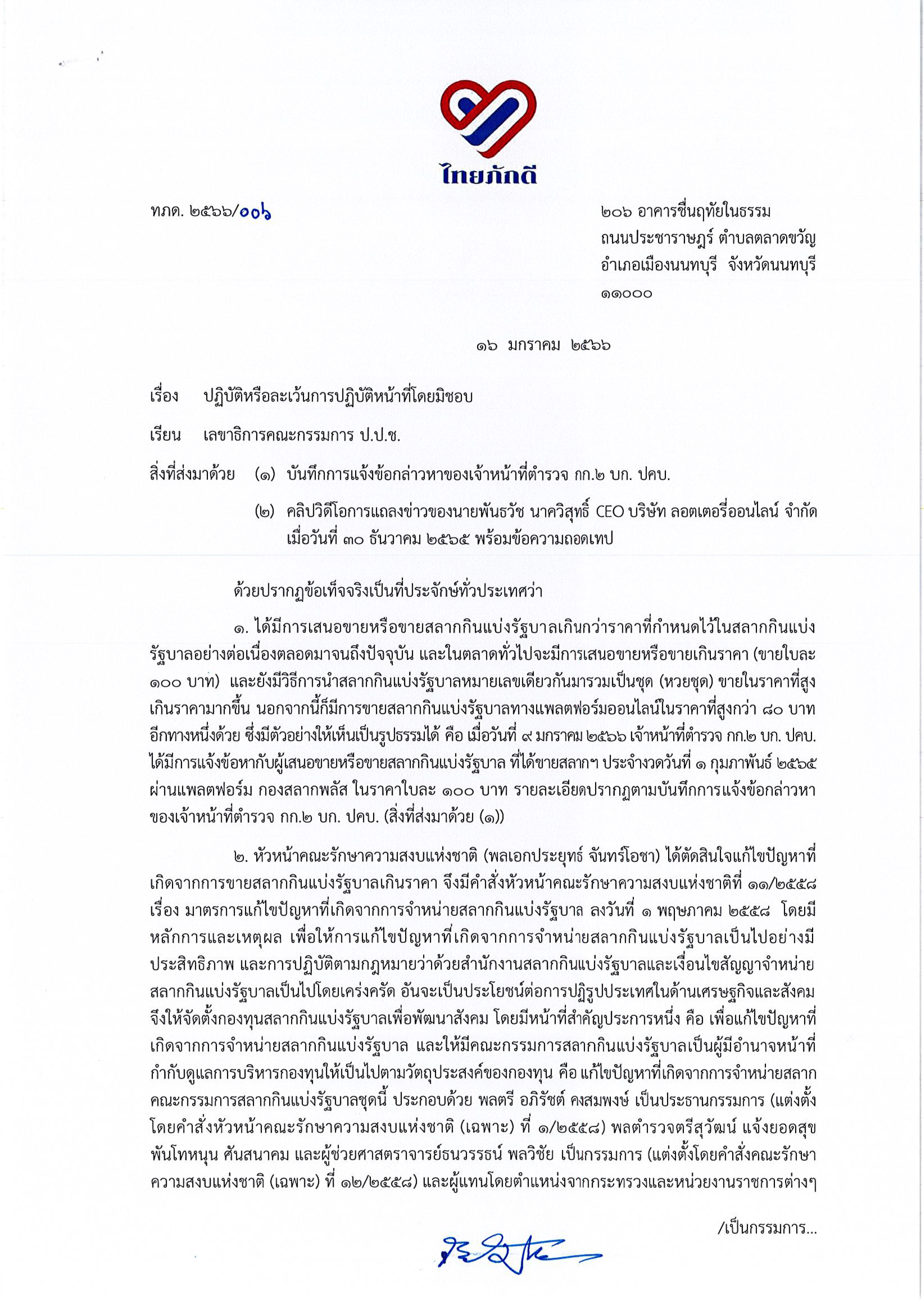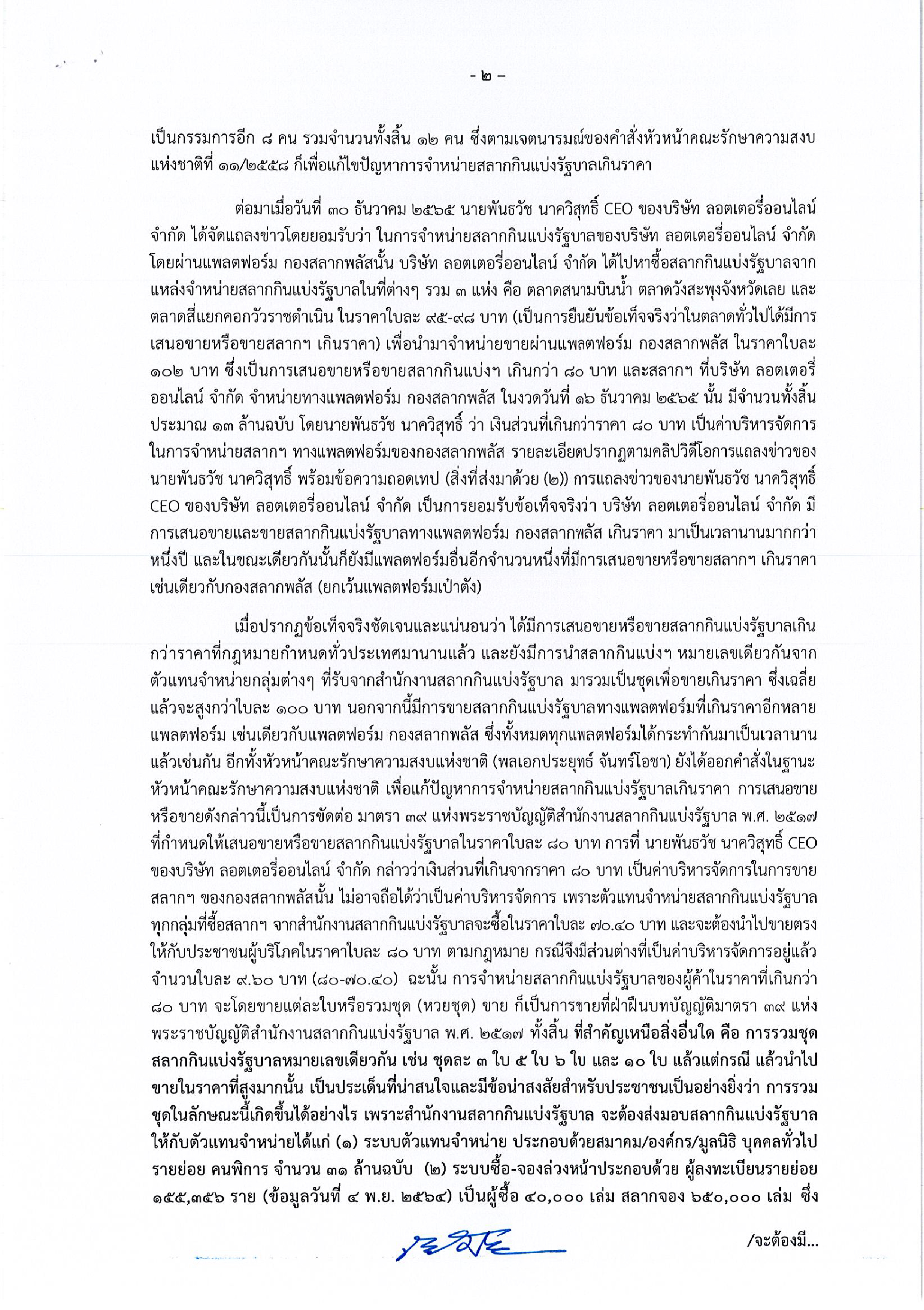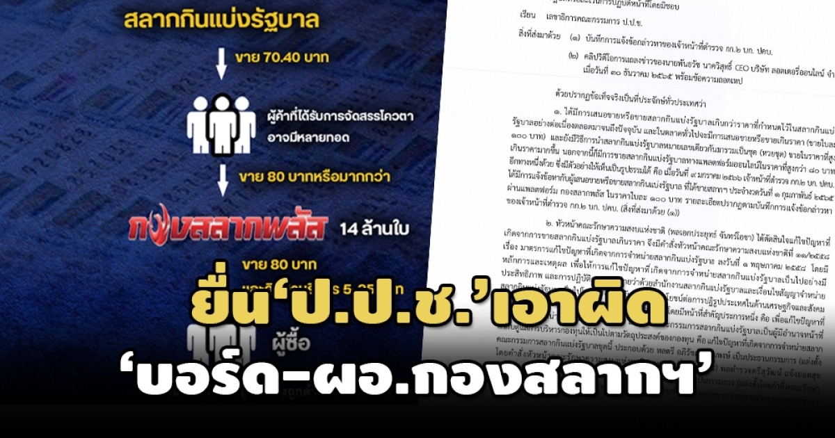 กรณีละเลยเพิกเฉย และไม่ดำเนินการแก้ไขปัญหาการขายสลากกินแบ่งรัฐบาลเกินราคา 80 บาท เนื่องจากปรากฏข้อเท็จจริงว่า บริษัท ลอตเตอรี่ออนไลน์ จำกัด ได้เสนอและขายสลากกินแบ่งรัฐบาลผ่านแพลตฟอร์ม ‘กองสลากพลัส’ เกินราคา 80 บาท มาเป็นเวลามากกว่า 1 ปี ขณะเดียวกัน มีแพลตฟอร์มอื่นอีกจำนวนได้มีการเสนอขายหรือขายสลากกินแบ่งเกินราคาเช่นเดียวกับกองสลากพลัสมาเป็นเวลานาน
