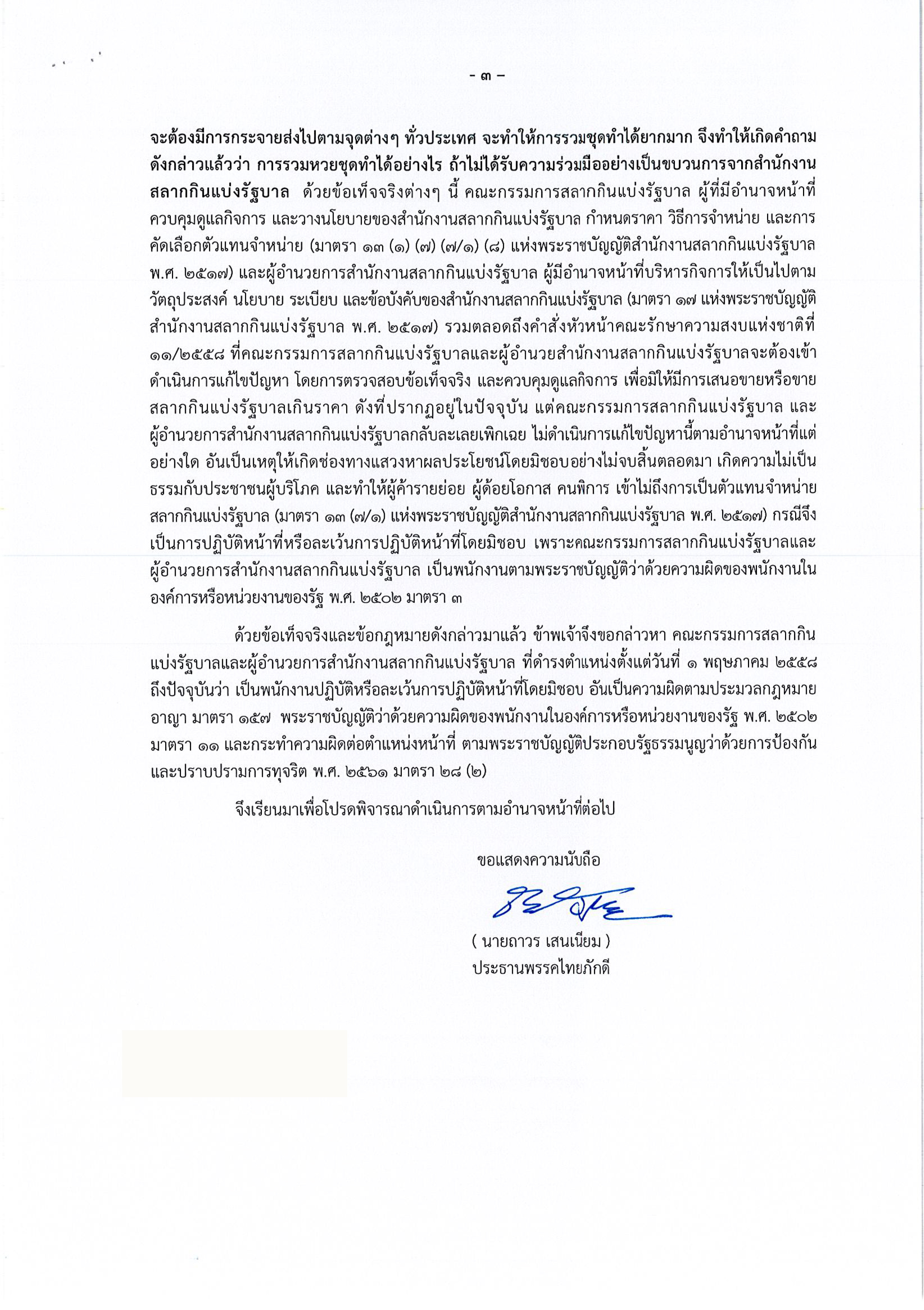 “ด้วยข้อเท็จจริงและข้อกฎหมายดังกล่าวมาแล้ว ข้าพเจ้าจึงขอกล่าวหา คณะกรรมการสลากกินแบ่งรัฐบาลและผู้อำนวยการสำนักงานสลากกินแบ่งรัฐบาล ที่ดำรงตำแหน่งตั้งแต่วันที่ 1 พฤษภาคม 2558 ถึงปัจจุบันว่า เป็นพนักงานปฏิบัติหรือละเว้นการปฏิบัติหน้าที่โดยมิชอบ อันเป็นความผิดตามประมวลกฎหมายอาญา มาตรา 157 พระราชบัญญัติว่าด้วยความผิดของพนักงานในองค์การหรือหน่วยงานของรัฐ พ.ศ.2502 มาตรา 11 และกระทำความผิดต่อตำแหน่งหน้าที่ ตามพระราชบัญญัติประกอบรัฐธรรมนูญว่าด้วยการป้องกันและปราบปรามการทุจริต พ.ศ.2561 มาตรา 28 (2) จึงเรียนมาเพื่อโปรดพิจารณาดำเนินการตามอำนาจหน้าที่ต่อไป” หนังสือของนายถาวร เสนเนียม ประธานพรรคไทยภักดี ลงวันที่ 16 ม.ค.2566 ระบุ