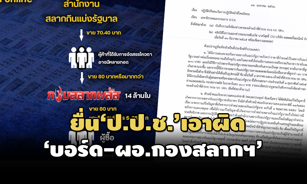 ประธานพรรค ‘ไทยภักดี’ ยื่นหนังสือ ‘ป.ป.ช.’ เอา ‘บอร์ด-ผอ.กองสลากฯ’ ละเว้นปฏิบัติหน้าที่ฯ กรณีปล่อยให้ ‘กองสลากพลัส’ ขายสลากฯเกินราคา 80 บาท