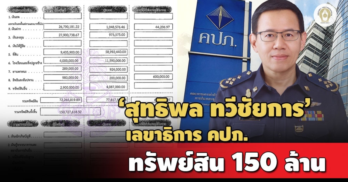 ป.ป.ช. เปิดบัญชีทรัพย์สิน 'สุทธิพล ทวีชัยการ' เลขาธิการคณะกรรมการกำกับและส่งเสริมการประกอบธุรกิจประกันภัย มีทรัพย์สินรวมกว่า 150 ล้าน ไร้หนี้สิน สะสมเครื่องประดับทองคำ/เพชร/ไข่มุก/ไพลิน-พระพุทธรูป-นาฬิกาหรูเพียบ รายได้ 12 ล้านต่อปี