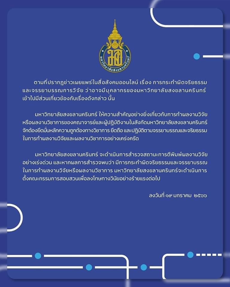 มหาวิทยาลัยสงขลานครินทร์ ได้ออกประกาศ ระบุว่า ตามที่ปรากฎข่าวเผยแพร่ในสื่อสังคมออนไลน์ เรื่อง การกระทำผิดจริยธรรมและจรรยาบรรณการวิจัย ว่าอาจมีบุคลากรของมหาวิทยาลัยสงขลานครันทร์