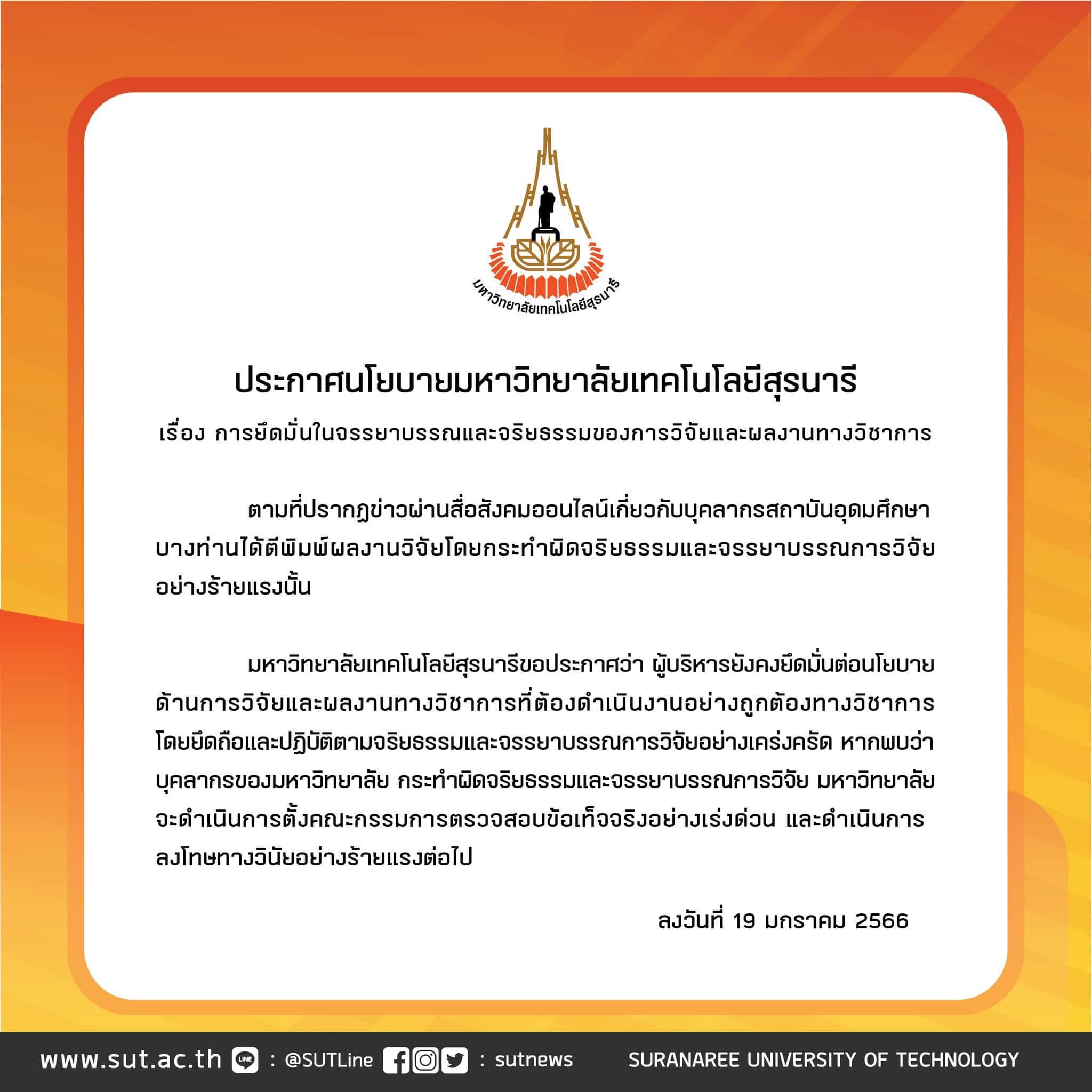 มหาวิทยาลัยเทคโนโลยีสุรนารีขอประกาศว่า ผู้บริหารยังคงยึดมั่นต่อนโยบายด้านการวิจัยและผลงานทางวิชาการที่ต้องดำเนินงานอย่างถูกต้องทางวิชาการโดยยึดถือและปฏิบัติตามจริยธรรมและจรรยาบรรณการวิจัยอย่างเคร่งครัด หากพบว่าบุคลากรของมหาวิทยาลัย กระทำผิดจริยธรรมและจรรยาบรรณการวิจัย มหาวิทยาลัยจะดำเนินการตั้งคณะกรรมการตรวจสอบข้อเท็จจริงอย่างเร่งด่วน และดำเนินการ