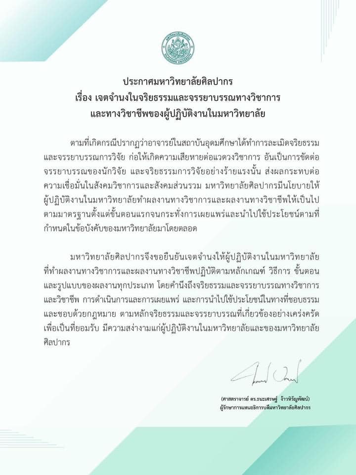 อนึ่งก่อนหน้านี้ ศาสตราจารย์ ดร.ภก.ธนะเศรษฐ์ ง้าวหิรัญพัฒน์ รักษาการอธิบดีมหาวิทยาลัยศิลปากร ได้ประกาศ เรื่อง เจตจำนงในจริยธรรมและจรรยาบรรณทางวิชาการและทางวิชาชีพของผู้ปฏิบัติงานในมหาวิทยาลัย ความว่า