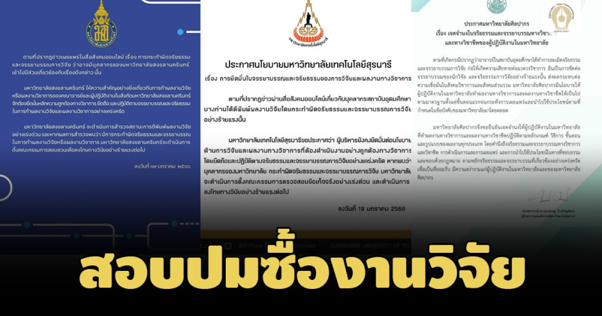 'มอ.-ม.สุรนารีฯ-ศิลปากร' ประกาศยึดมั่นในจรรยาบรรณ-จริยธรรมของการวิจัย ตั้งคณะกรรมการตรวจสอบปมซื้อขายงานวิจัย หากพบผู้กระทำผิดจริงโดนลงโทษวินัยอย่างร้ายแรง