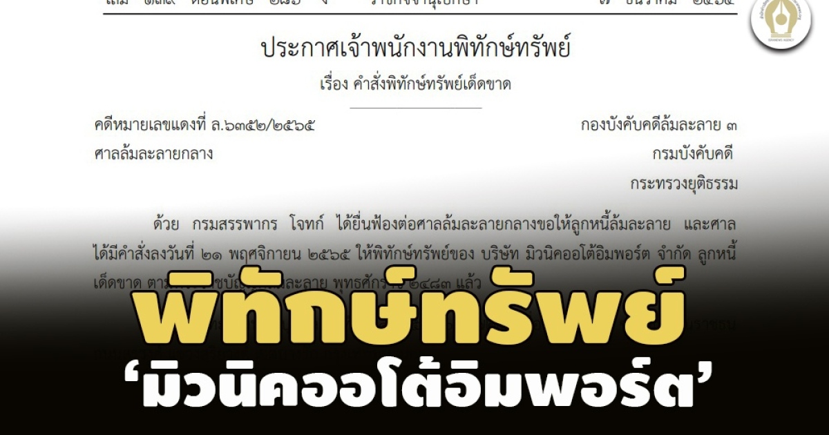 ด้วย กรมสรรพากร โจทก์ ได้ยื่นฟ้องต่อศาลล้มละลายกลางขอให้ลูกหนี้ล้มละลาย และศาลได้มีคำสั่งลงวันที่ 21 พฤศจิกายน 2565 ให้พิทักษ์ทรัพย์ของ บริษัท มิวนิคออโต้อิมพอร์ต จำกัด ลูกหนี้ เด็ดขาด ตามพระราชบัญญัติล้มละลาย พุทธศักราช 2483 แล้ว ลูกหนี้ ทะเบียนนิติบุคคลเลขที่ 0105554054721 ที่อยู่ 38/9 ซอยอนุมานราชธน ถนนสุรวงศ์ แขวงสุริยวงศ์ เขตบางรัก กรุงเทพมหานคร