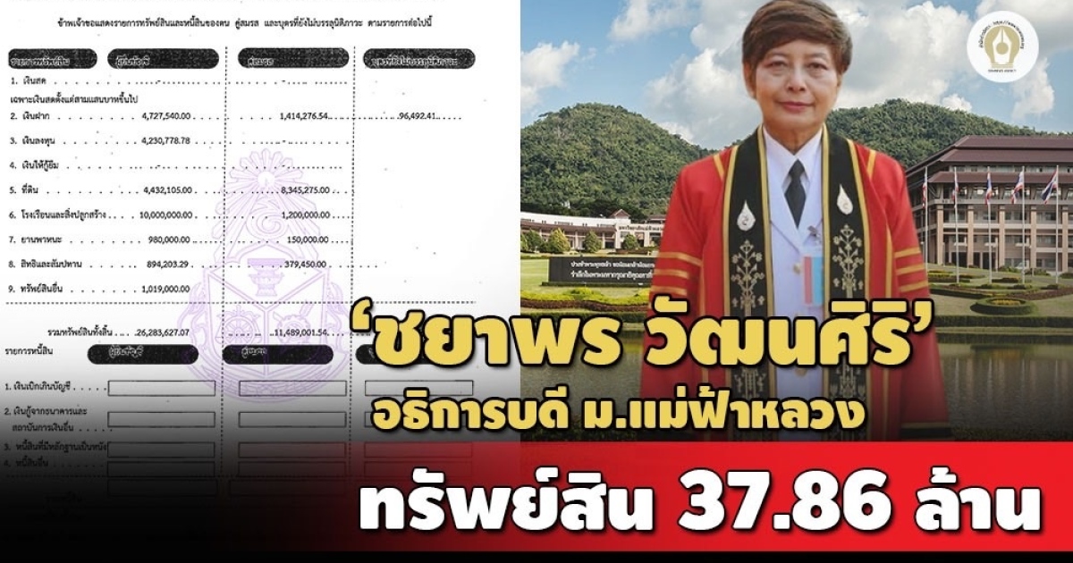 ป.ป.ช. เปิดบัญชีทรัพย์สิน ชยาพร วัฒนศิริ อธิการบดีมหาวิทยาลัยแม่ฟ้าหลวง มีทรัพย์สินรวมกว่า 37 ล้าน ไร้หนี้สิน ลงทุนเพียบ สะสมแหวนเพชร-สร้อยมุก-ต่างหูเพชร-จี้เพชร รายได้ 3.7ล้านต่อปี