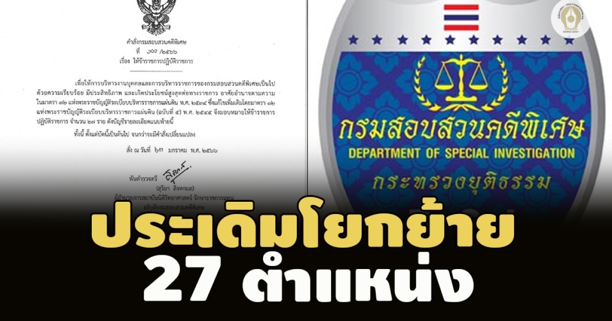 ทั้งนี้ ในคำสั่งโยกย้ายฉบับนี้ ระบุว่า เพื่อให้การบริหารงานบุคคลและการบริหารราชการของกรมสอบสวนคดีพิเศษเป็นไปด้วยความเรียบร้อย มีประสิทธิภาพ และเกิดประโยชน์สูงสุดต่อทางราชการ อาศัยอํานาจตามความ ในมาตรา 32 แห่งพระราชบัญญัติระเบียบบริหารราชการแผ่นดิน พ.ศ. 2534 ซึ่งแก้ไขเพิ่มเติมโดยมาตรา 12 แห่งพระราชบัญญัติระเบียบบริหารราชการแผ่นดิน (ฉบับที่ 5) พ.ศ. 2545 จึงมอบหมายให้ข้าราชการ ปฏิบัติราชการ จํานวน 27 ราย ตั้งแต่บัดนี้เป็นต้นไป (ดูคำสั่งประกอบ)