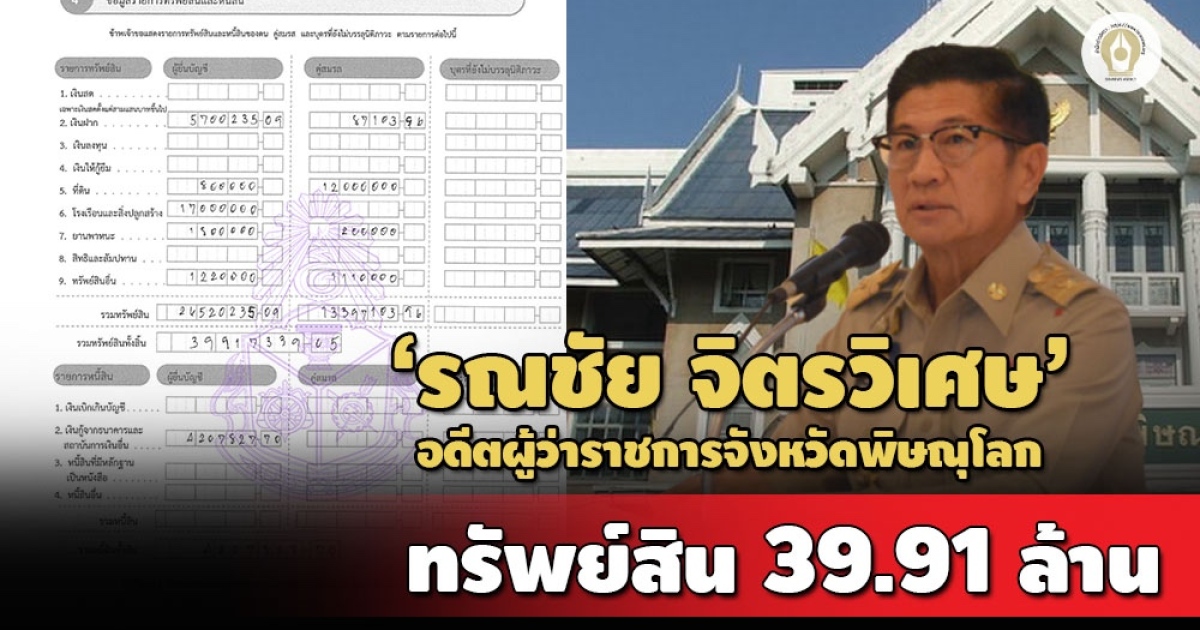 ป.ป.ช. เปิดบัญชีทรัพย์สิน 'รณชัย จิตรวิเศษ' หลังพ้นตำแหน่งผู้ว่าราชการจังหวัดพิษณุโลก มีทรัพย์สินรวมกว่า 39 ล้าน สะสมอาวุธปืน-พระเครื่อง-นาฬิกาหรู-สร้อยคอทองคำ-แหวนเพชรเพียบ
