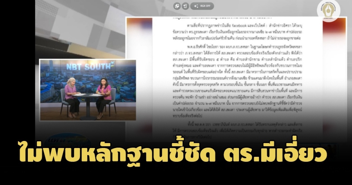 ภูธรสงขลา แจง สภ.สะเดาตรวจสอบปมสื่อมาเลย์ฯแฉ ตร.เรียกสินบนแลกปล่อยรถถูกขโมยข้ามแดนแล้ว ยังไม่พบมีหลักฐานชี้ชัดตำรวจคนไหนเกี่ยวข้อง เตรียมประสานผู้เสียหายให้ข้อมูลเพิ่มเติม