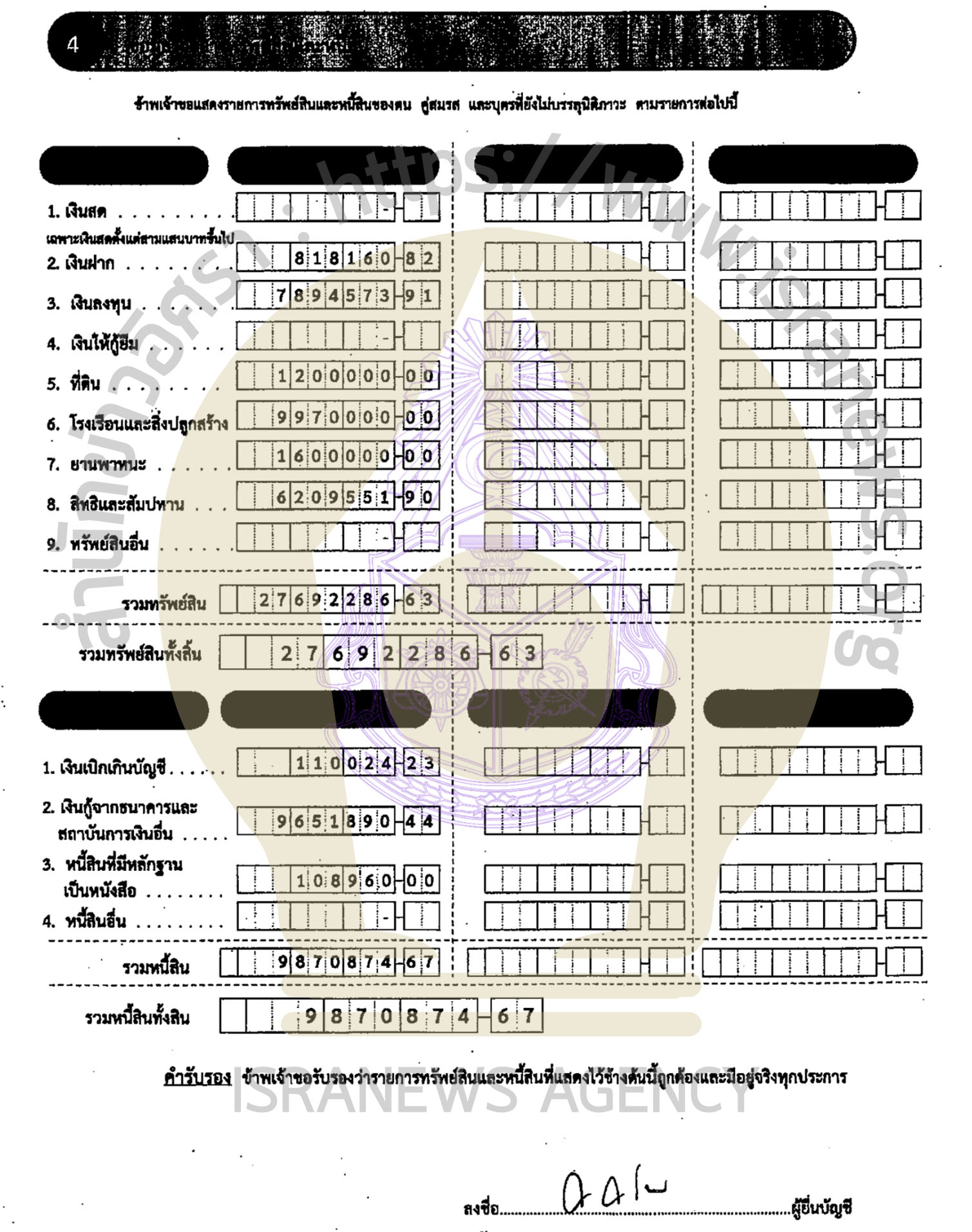 ส่วนหนี้สิ้นแจ้งจำนวน 9,870,874 บาท ประกอบด้วย เงินเบิกเกินบัญชี 110,024 บาท เงินกู้จากธนาคารและสถาบันการเงินอื่น 9,651,890 บาท และหนี้สินที่มีหลักฐานเป็นหนังสือ 108,960 บาท