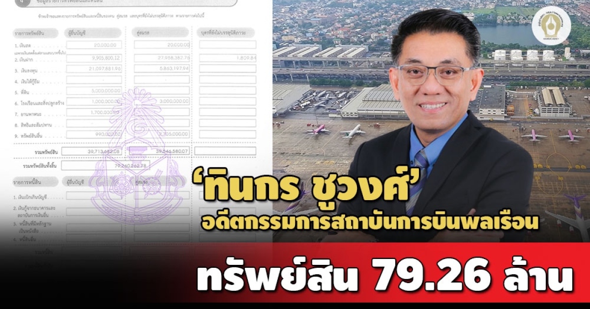 ป.ป.ช. เปิดบัญชีทรัพย์สิน 'ทินกร ชูวงศ์' กรณีพ้นตำแหน่งกรรมการสถาบันการบินพลเรือน มีทรัพย์สินรวมกว่า 79 ล้าน ไร้หนี้สิน ลงทุนเพียบ สะสมแหวนเพชร-นาฬิกาหรู-สร้อยคอทองคำรายได้ 2.7 ล้านต่อปี