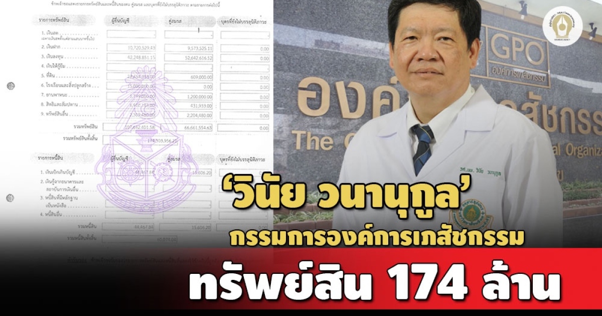 ป.ป.ช. เปิดบัญชีทรัพย์สิน 'วินัย วนานุกูล' เข้ารับตำแหน่งกรรมการองค์การเภสัชกรรม มีทรัพย์สินรวมกว่า 174 ล้าน ลงทุนเพียบ สะสมทองคำแท่ง-นาฬิกาหรู-สร้อยคอทองคำ-แหวนเพชร รายได้ 4.2 ล้านต่อปี