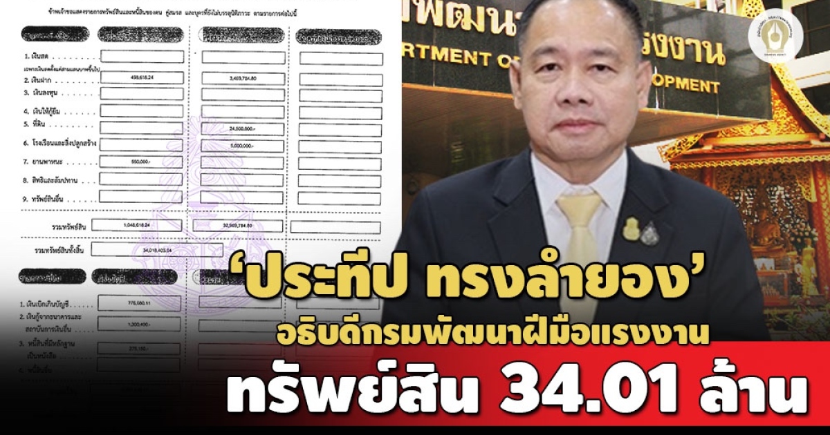 ป.ป.ช. เปิดบัญชีทรัพย์สิน 'ประทีป ทรงลำยอง' อธิบดีกรมพัฒนาฝีมือแรงงาน มีทรัพย์สินรวมกว่า 34 ล้าน ที่ดินเพียบ รายได้ 1.6 ล้านต่อปี