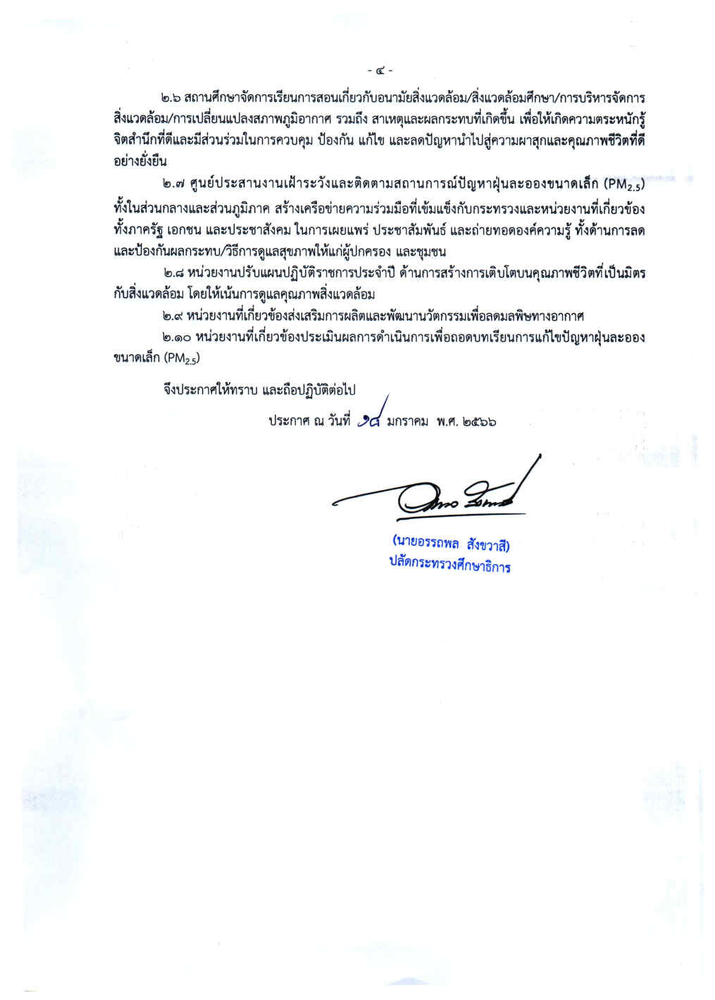 ทางด้าน นายอรรถพล สังขวาสี ปลัดกระทรวงศึกษาธิการ ลงนามประกาศกระทรวงศึกษาธิการ เรื่อง มาตรการป้องกัน แก้ไขปัญหาฝุ่นละอองขนาดเล็ก (pm 2.5) เมื่อวันที่ วันที่ 18 มกราคม 2566 เพื่อให้การดำเนินงานด้านป้องกัน แก้ไขปัญหาฝุ่นละอองขนาดเล็ก (pm 2.5) ของกระทรวงศึกษาธิการ (ศธ.) เป็นไปอย่างมีประสิทธิภาพ รวดเร็ว และครอบคลุมทั่วประเทศ