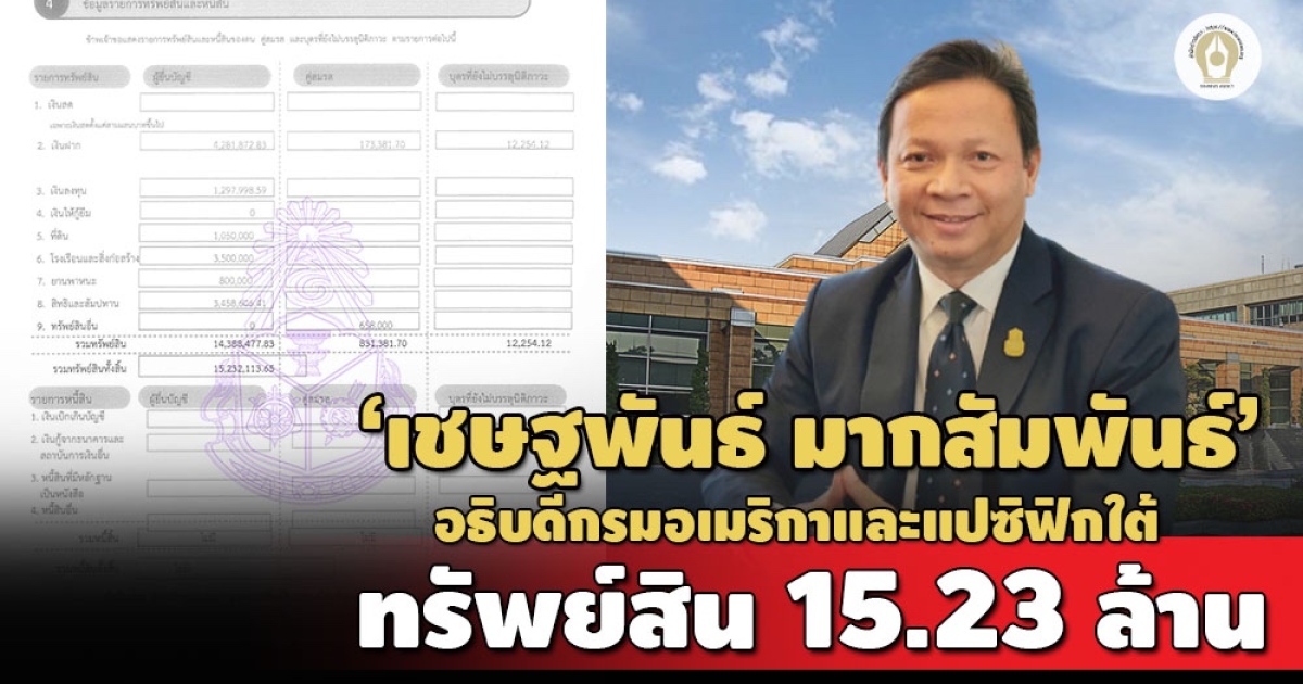 ป.ป.ช. เปิดบัญชีทรัพย์สิน 'เชษฐพันธ์ มากสัมพันธ์' อธิบดีกรมอเมริกาและแปซิฟิกใต้ มีทรัพย์สินรวมกว่า 15 ล้าน ลงทุนเพียบ รายได้ 1.1 ล้านต่อปี