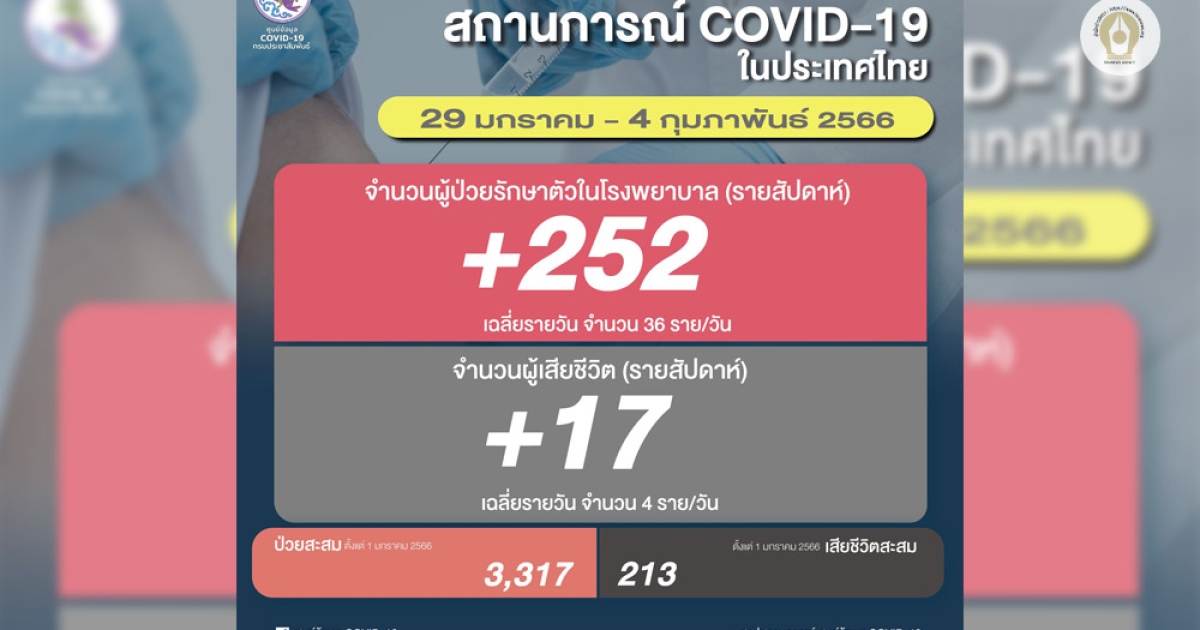 สถานการณ์โควิดไทย สัปดาห์ล่าสุด 29 ม.ค. - 4 ก.พ. 2566 ติดเชื้อเข้ารักษาใน รพ.ใหม่ 252 ราย เฉลี่ย 36/วัน เสียชีวิต 17 ราย เฉลี่ย 4/วัน อาการหนัก 122 ราย