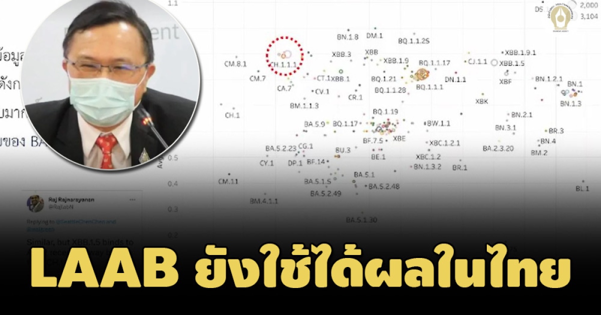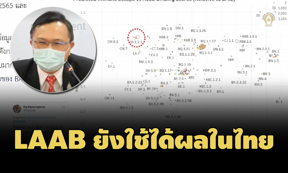 "ประเทศไทย เมื่อต้นปีที่แล้ว BA.1 พบมากสุด ถัดมาถูกเบียดเป็น BA.2 จากนั้น BA.5 เข้ามาแทนที่ ตอนนี้ก็ลดลงไป กลายเป็นวันนี้ BN.1 ตั้งแต่ ม.ค. 2566 ที่เข้ามาเป็นตัวหลักในประเทศไทย มี CH.1 มีพบบ้าง แต่ไม่ได้หนาขึ้น ดังนั้น LAAB ในบ้านเรายังใช้ ไม่ได้กระทบมาก แต่เจอ CH.1 ประสิทธิผลอาจจะลดลงเล็กน้อย แต่คนติด CH.1.1 ไม่ได้เยอะ ก็นยังสามารถใช้ LAAB ได้ต่อไป ส่วน XBB ยังไม่ได้เห็นอะไรมาก แต่ที่พบเพิ่มขึ้นอาจมาจากนักท่องเที่ยวต่างประเทศ แต่จะจับตาดูว่าจะพบมากขึ้นเร็วหรือไม่" นพ.ศุภกิจกล่าว