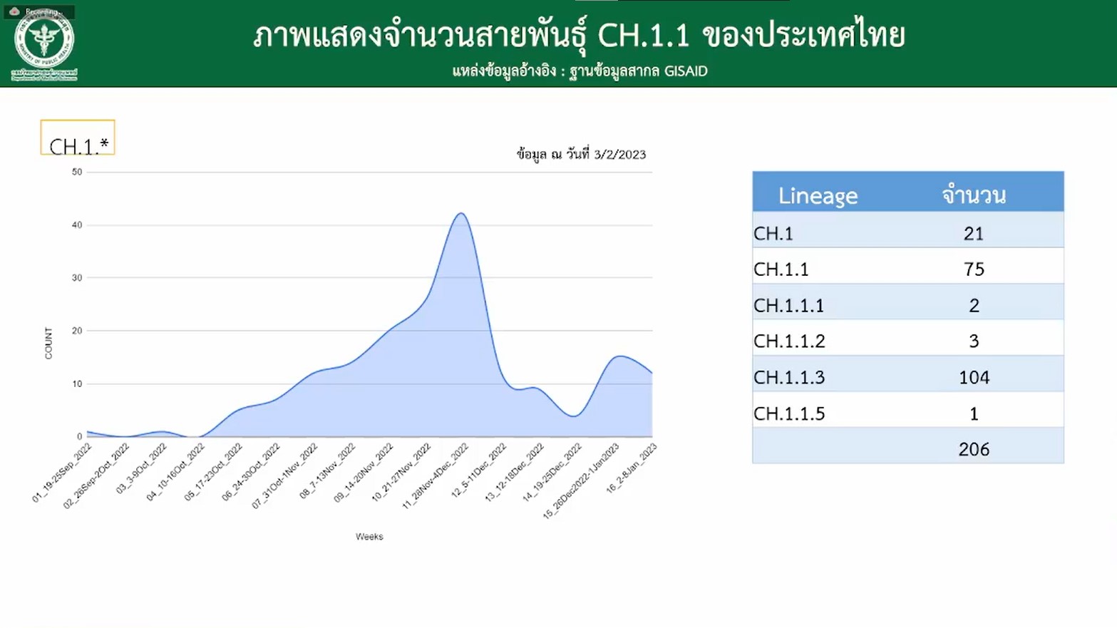 สธ.เผย CH.1.1 หลบภูมิได้ดี แต่แพร่ช้ากว่า BN.1 พันธุ์หลักในไทย ย้ำ LAAB ยังใช้ได้ผล ด้าน WHO จับตา 4 โควิด 'BF.7-BQ.1-BA.2.75-XBB' ส่วนผลตรวจเชื้อก่อนออกประเทศพบติดเชื้อน้อยลง