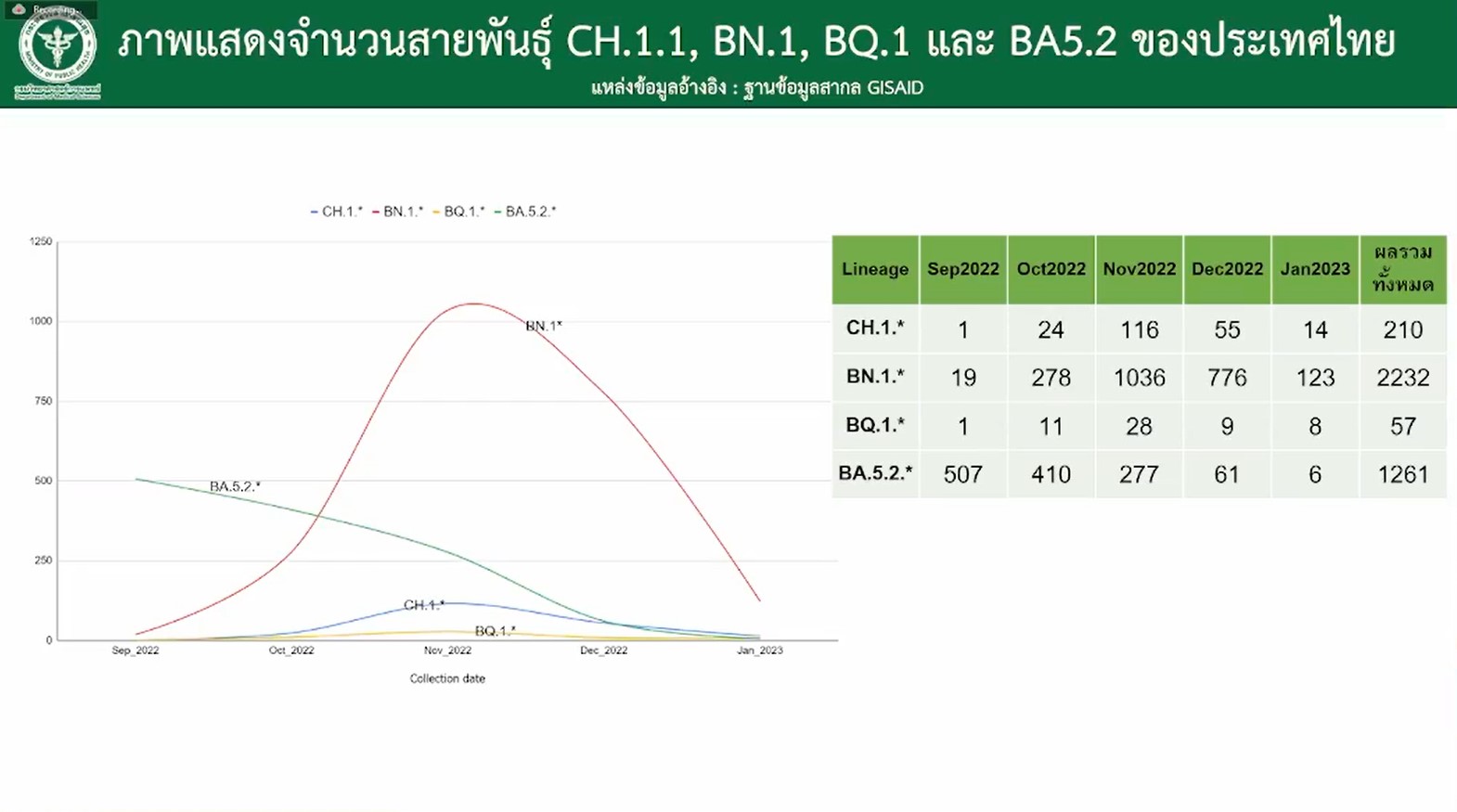 "โดยสรุป XBB.1.5 ที่ระบาดมากในอเมริกา ซึ่งหลบภูมิได้ค่อนข้างสูง ยังไม่มีในประเทศไทย ในไทยยังเป็น BN.1 มากที่สุด โดยเฉพาะ BN.1.3 ส่วน CH.1.1 ที่หลบภูมิ แต่จับกับเซลล์ได้ไม่ดี ก็พบบ้าง สะสมประมาณ 200-300 ราย สถานการณ์ไม่ได้มากขึ้น แต่ยังต้องเฝ้าระวังอย่างเข้มแข็งต่อไป หากมีปัญหาจะตรวจจับได้ และรายงานไปยัง GISAID เสมอเพื่อให้ข้อมูลสมบูรณ์ที่สุด" นพ.ศุภกิจ ระบุ