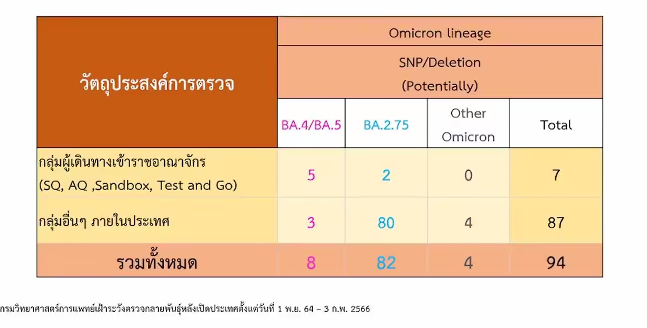 สำนักข่าวอิศรา (www.isranews.org) รายงานว่าเมื่อวันที่ 7 ก.พ. 2566 นพ.ศุภกิจ ศิริลักษณ์ อธิบดีกรมวิทยาศาสตร์การแพทย์ รายงานความคืบหน้าสายพันธุ์โควิด-19 ในประเทศไทยว่า จากระบบเฝ้าระวังการเก็บตัวอย่างตรวจสายพันธุ์โควิด-19 ในสัปดาห์ที่ผ่านมา วันที่ 28 ม.ค. - 3 ก.พ. 2566 โดยศูนย์วิทยาศาสตร์การแพทย์ทั่วประเทศ มีการตรวจเบื้องต้น 94 ราย ส่วนใหญ่เป็นคนในประเทศ 87 ราย และต่างชาติ 7 ราย พบสายพันธุ์ BA.2.75 เป็นส่วนใหญ่ 82 ราย คิดเป็น 87.2% สายพันธุ์ BA.4/BA.5 จำนวน 8 ราย คิดเป็น 8.5% และสายพันธุ์อื่นๆ อีก 4.3%