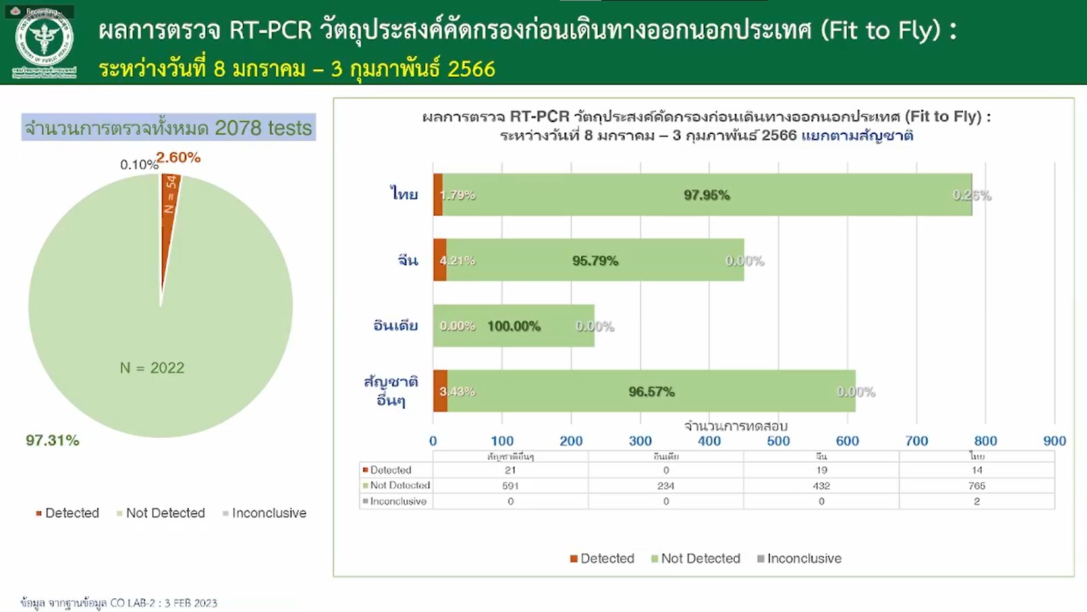 ทั้งนี้ หลังจากที่นักท่องเที่ยวเดินทางเข้าไทยมากขึ้น ยังไม่มีส่งสัญญาณพบการติดเชื้อมากขึ้น ในส่วนของประเทศจีนมีการติดเชื้อเฉพาะในประเทศ และพบว่าสายพันธุ์ที่แพร่ระบาดในจีนคือสายพันธุ์เดิมที่เคยระบาดในไทย ดังนั้น ไม่น่าจะเป็นปัญหาใหญ่หากผู้ติดเชื้อจากจีนนำเชื้อเข้ามาในไทย