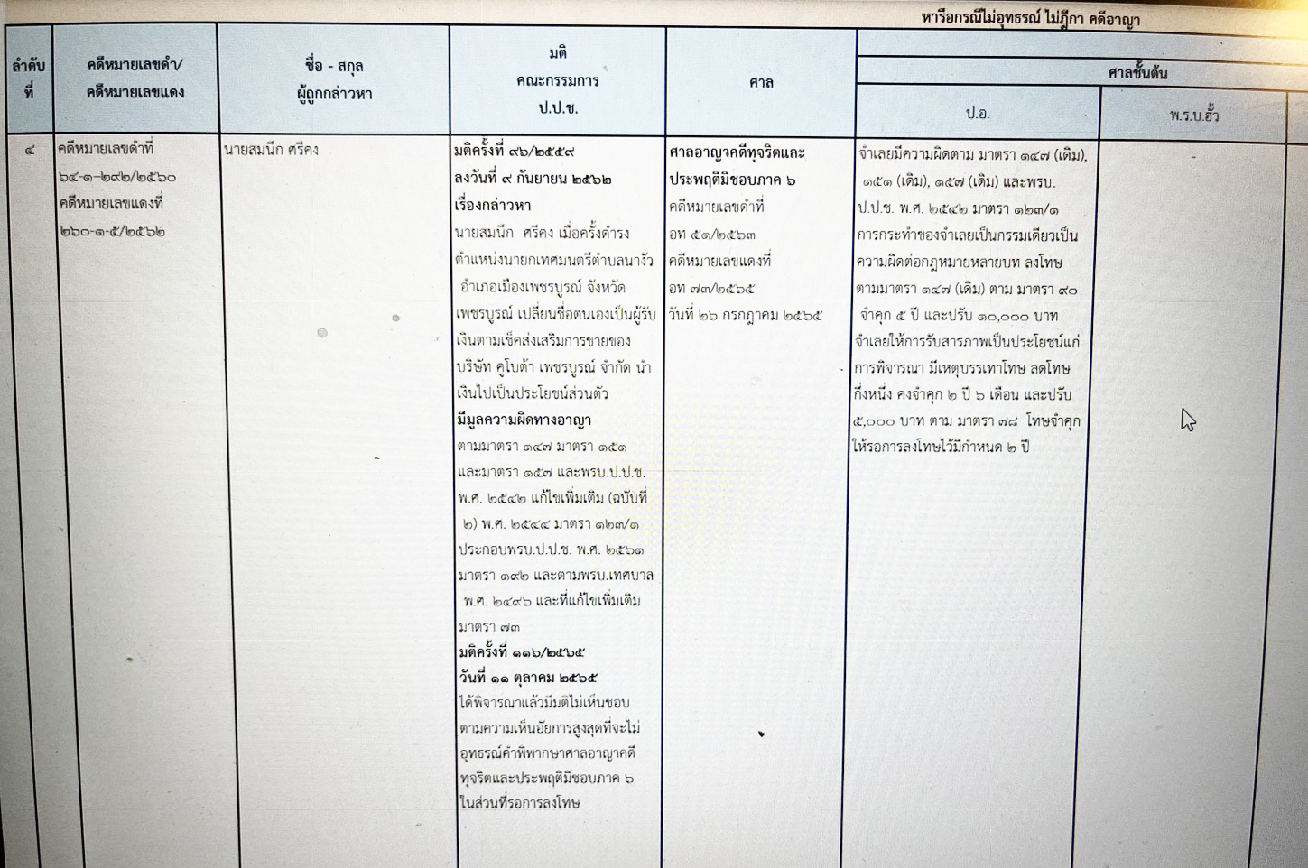 ซึ่งถูกคณะกรรมการ ป.ป.ช. ลงมติชี้มูลความผิดทางอาญา ตาม ป.อ. 147 , 151 และ 157 และ พ.ร.บ.ป.ป.ช.พ.ศ. 2542 แก้ไขเพิ่มเติม (ฉบับที่ 2) พ.ศ.2544 มาตรา 123/1 ประกอบพ.ร.บ.ป.ป.ช. พ.ศ. 2561 มาตรา 192 และตาม พ.ร.บ.เทศบาล พ.ศ. 2496 และที่แก้ไขเพิ่มเติมมาตรา 73 ตั้งแต่เมื่อวันที่ 9 กันยายน 2562 ที่ผ่านมา