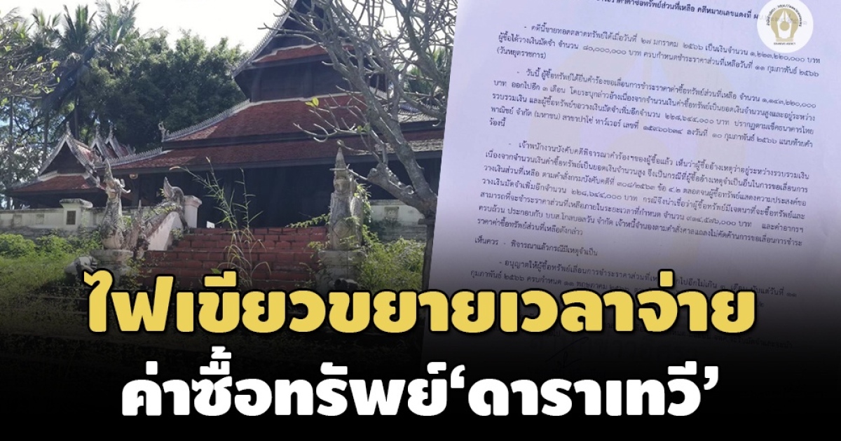 ‘เจ้าพนักงานบังคับคดี' จ.เชียงใหม่ มีคำสั่งอนุญาตให้ I Thermal เลื่อนเวลาจ่ายเงินค่าซื้อทรัพย์ ‘โรงแรมดาราเทวี’ ในคดีหมายเลขแดง ‘ผบ. 2124/2561’ ออกไปอีก 3 เดือน หลังวางค่าประกันเพิ่มอีก 228 ล้านบาท เชื่อมีเจตนาซื้อทรัพย์