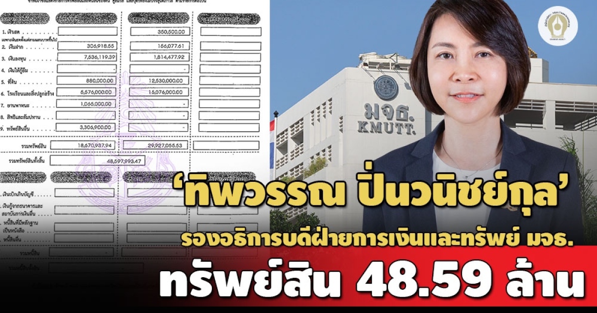 ป.ป.ช. เปิดบัญชีทรัพย์สิน 'ทิพวรรณ ปิ่นวนิชย์กุล' รองอธิการบดี มหาวิทยาลัยเทคโนโลยีพระจอมเกล้าธนบุรี ทรัพย์สิน 48 ล้าน สะสมสร้อยคอทองคำ-เครื่องประดับหรูเพียบ รายได้ 3.4 ล้านต่อปี