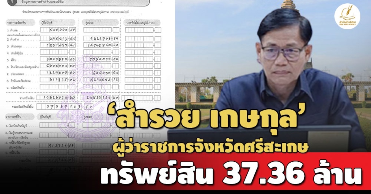 ป.ป.ช. เปิดบัญชีทรัพย์สิน 'สำรวย เกษกุล' กรณีเข้ารับตำแหน่งผู้ว่าราชการจังหวัดศรีสะเกษ ทรัพย์สิน 37 ล้าน สะสมที่ดิน ลงทุนเพียบ รายได้ 1.2 ล้านต่อปี