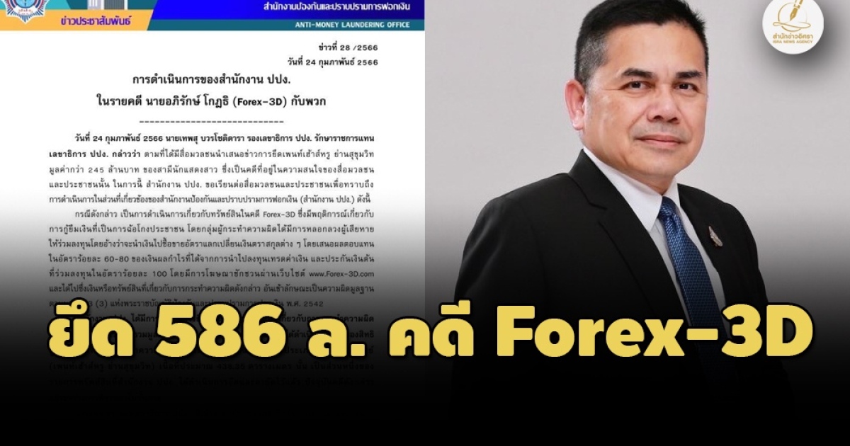 สืบเนื่องจากที่เป็นข่าวเมื่อเดือน ก.ค.2565 กรณีสำนักงานป้องกันและปราบปรามการฟอกเงิน (ปปง.) เข้ายึดทรัพย์นายอภิรักษ์ โกฎธิ ผู้ก่อตั้งแชร์ FOREX-3 D กับพวกเป็นจำนวน 3 ครั้งคิดเป็นมูลค่ารวม 570.9 ล้านบาท โดยการยึดทร้พย์จำนวน 3 ครั้งนั้นประกอบไปด้วย