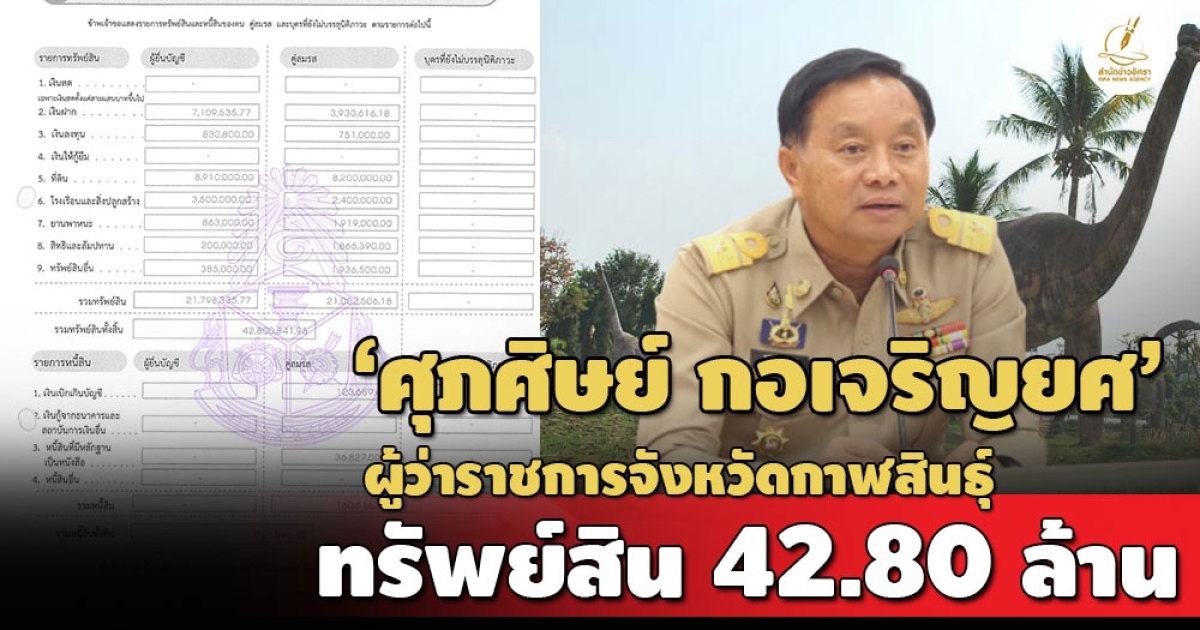 ป.ป.ช. เปิดบัญชีทรัพย์สิน 'ศุภศิษย์ กอเจริญยศ' กรณีเข้ารับตำแหน่งผู้ว่าราชการจังหวัดกาฬสินธุ์ ทรัพย์สินกว่า 42 ล้าน เงินฝากรวม 20 บัญชี 11 ล. ที่ดิน 9 รายการ 17.1 ล. สะสมสร้อยคอทองคำ-เครื่องประดับเพชร-ปืน-แหวนเพชร