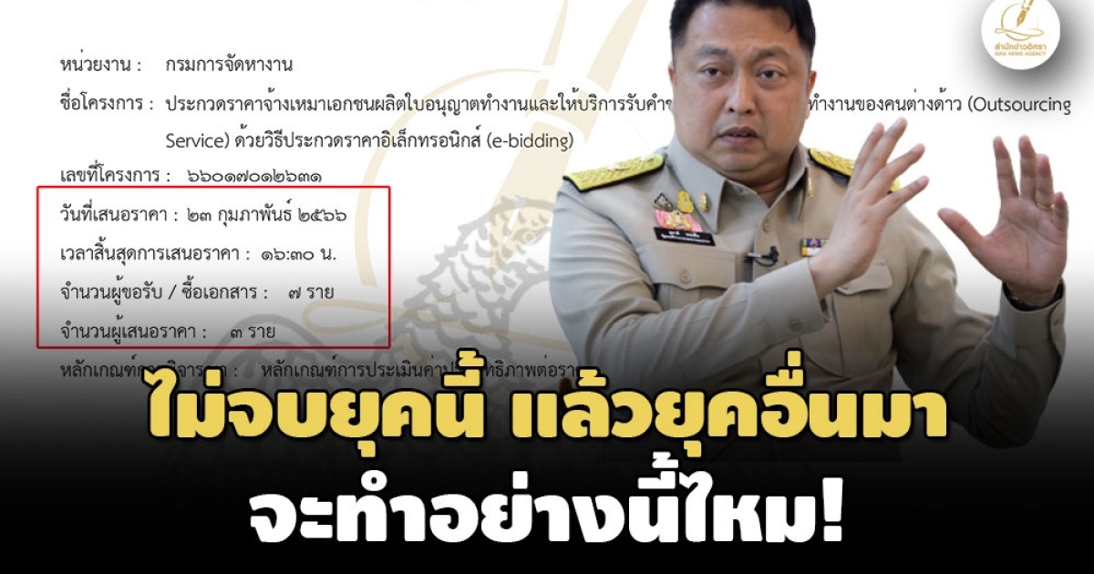 กรณีสำนักข่าวอิศรา (www.isranews.org) ตรวจสอบฐานข้อมูลจัดซื้อจัดจ้างหน่วยงานภาครัฐ กรมบัญชีกลาง http://process.gprocurement.go.th/ พบว่า เมื่อวันที่ 23 ก.พ.2566 กรมการจัดหางาน ได้เปิดให้เอกชนที่สนใจเสนอราคางานโครงการจ้างเหมาเอกชนผลิตใบอนุญาตทำงาน และให้บริการรับคำขอและการแจ้งการทำงานของคนต่างด้าว (Outsourcing Service) วงเงินงบประมาณ 7,950,000 บาท สอบรอบ โดยมีเอกชน จำนวน 3 ราย จาก 7 ราย ที่มาติดต่อขอรับ/ซื้อซองเอกสารประกวดราคา กำหนดราคากลาง 7,875,000,000 บาท แต่ไม่ได้มีการเปิดเผยรายละเอียดชื่อเอกชน ทั้งในส่วนที่ซื้อซอง และยื่นซองประกวดราคาไว้แต่อย่างใด