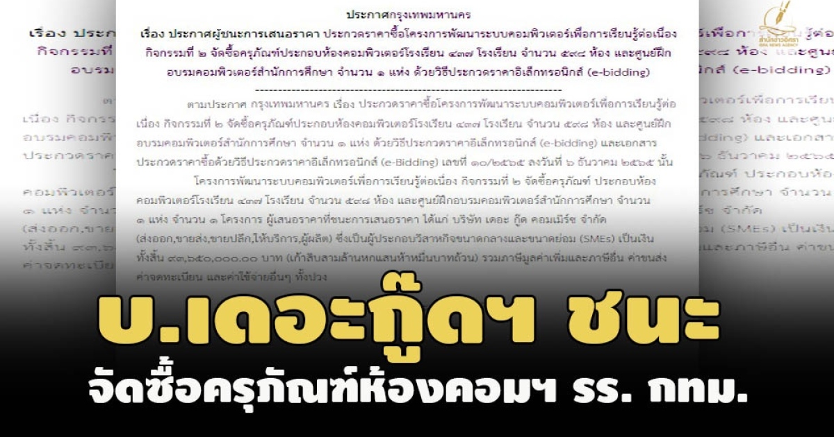 สำนักข่าวอิศรา (www.isranews.org) รายงานว่า วันที่ 23 ก.พ.2566 iระบบจัดซื้อจัดจ้างภาครัฐ กรมบัญชีกลางได้เผยแพร่ ประกาศกรุงเทพมหานคร เรื่อง ประกาศผู้ชนะการเสนอราคา ประกวดราคาซื้อโครงการพัฒนาระบบคอมพิวเตอร์เพื่อการเรียนรู้ต่อเนื่อง กิจกรรมที่ 2 จัดซื้อครุภัณฑ์ประกอบห้องคอมพิวเตอร์โรงเรียน 437 โรงเรียน จำนวน 598 ห้อง และศูนย์ฝึกอบรมคอมพิวเตอร์สำนักการศึกษา จำนวน 1 แห่ง ด้วยวิธีประกวดราคาอิเล็กทรอนิกส์ (e-bidding) ผู้เสนอราคาที่ชนะการเสนอราคา ได้แก่ บริษัท เดอะ กู๊ด คอมเมิร์ซ จำกัด ทั้งสิ้น 93,650,000 บาท (ดูเอกสาร)