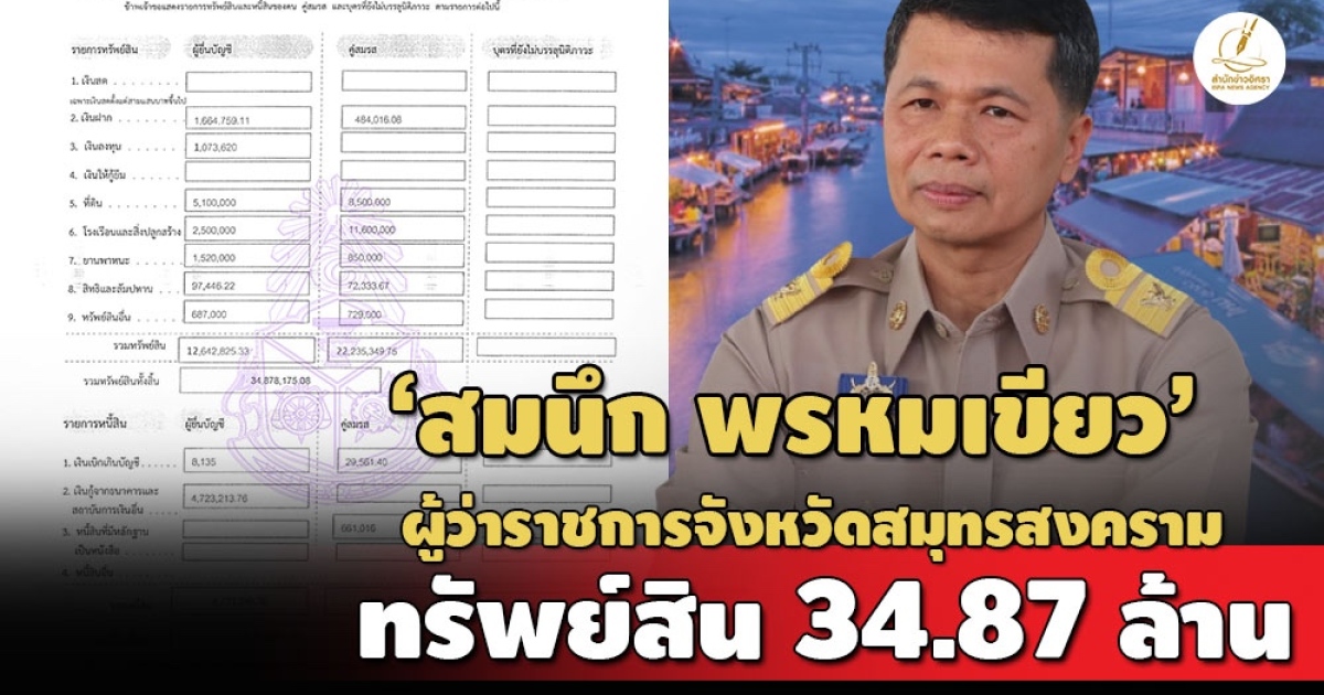 ป.ป.ช. เปิดบัญชีทรัพย์สิน 'สมนึก พรหมเขียว' กรณีเข้ารับตำแหน่งผู้ว่าราชการจังหวัดสมุทรสงคราม ทรัพย์สินกว่า 34 ล้าน สะสมสร้อยคอทองคำ-หลวงพ่อทวด ภรรยามีหอพักที่สงขลา-ทองคำแท่งหนัก 10 บาท