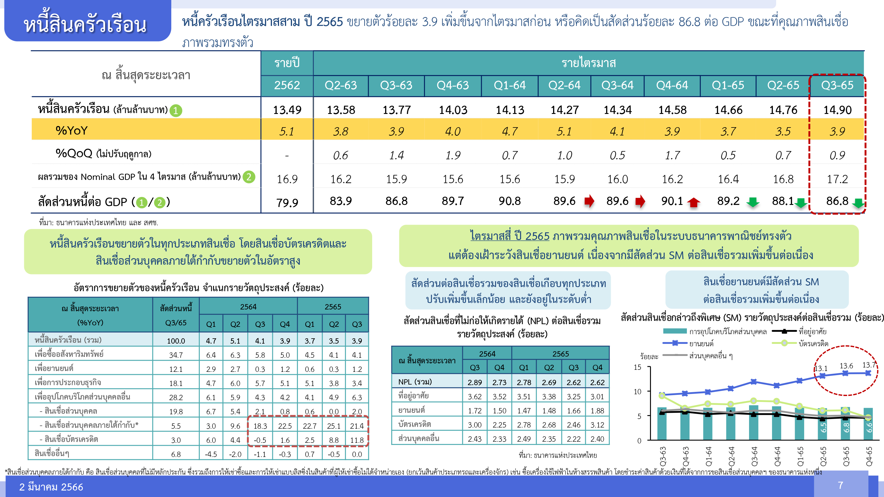 อย่างไรก็ตาม เมื่อพิจารณาการขยายตัวของหนี้สินครัวเรือน พบว่าในช่วงไตรมาส 3/2565 สินเชื่อส่วนบุคคลภายใต้กำกับมีการขยายตัว 21.4% ซึ่งเป็นอัตราการขยายตัวที่สูงกว่า 20% ต่อเนื่องกัน 4 ไตรมาส และสินเชื่อบัตรเครดิตที่ขยายตัว 11.8% ขณะที่สัดส่วนสินเชื่อที่ไม่ก่อให้เกิดรายได้ (NPL) ต่อสินเชื่อรวมรายวัตถุประสงค์ทรงตัวที่ระดับ 2.62% แต่สินเชื่อยานยนต์ มีสัดส่วนสินเชื่อกล่าวถึงพิเศษ (SM) ต่อสินเชื่อรวมเพิ่มขึ้นต่อเนื่อง