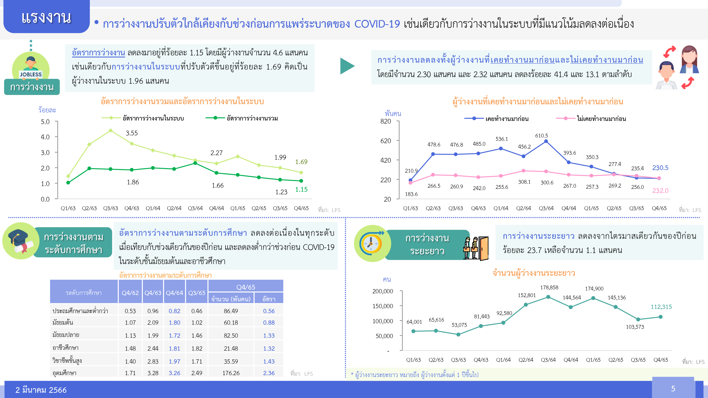 สำหรับอัตราการว่างงานในช่วงไตรมาส 4/2565 ลดลงมาอยู่ที่ 1.15% โดยมีผู้ว่างงาน 4.6 แสนคน ขณะที่การว่างงานในระบบปรับตัวดีขึ้นมาอยู่ที่ 1.68% หรือคิดเป็นผู้ว่างงานในระบบ 1.96 แสนคน ทั้งนี้ การว่างงานตามระดับการศึกษาลดลงต่อเนื่องในทุกระดับการศึกษา และผู้ว่างงานระยะยาวลดลงมาอยู่ที่ 1.1 แสนคน หรือลดลง 23.7% เมื่อเทียบกับช่วงเดียวกันของปีก่อน แต่เพิ่มขึ้นเล็กน้อยเมื่อเทียบกับไตรมาส 3/2565 ที่มีผู้ว่างงานระยะยาว 1.03 แสนคน