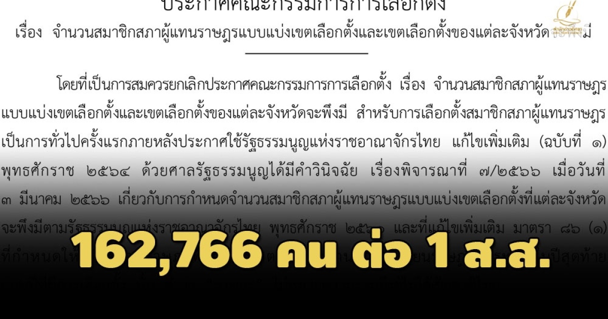 ราชกิจจานุเบกษา แพร่ประกาศคณะกรรมการการเลือกตั้ง จำนวนสมาชิก ส.ส.แบบแบ่งเขตเลือกตั้ง-เขตเลือกตั้งแต่ละจังหวัดจะพึงมี หลังมติศาล รธน. ชี้คำว่าราษฎร ไม่ได้หมายรวมถึงผู้ไม่ได้สัญชาติไทย คำนวณจากจำนวนราษฎร 162,766 คน ต่อ ส.ส. 1 คน - กทม. อยู่ที่ 33 คน / 33 เขตเลือกตั้ง ยอดเชียงราย, เชียงใหม่, ตาก, สมุทรสาคร จำนวนลดลง