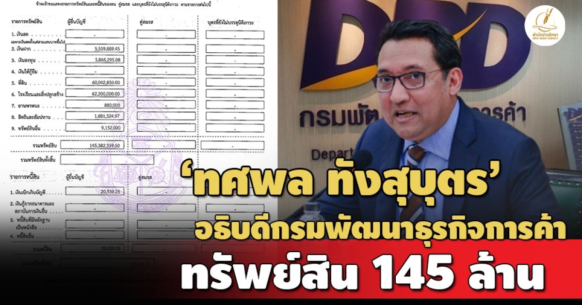 ป.ป.ช. เปิดบัญชีทรัพย์สิน 'ทศพล ทังสุบุตร' อธิบดีกรมพัฒนาธุรกิจการค้า กรณีทุก 3 ปี ตลอดเวลาที่ยังดำรงตำแหน่งเป็นเจ้าหน้าที่รัฐ ทรัพย์สินกว่า 145 ล้าน สะสมที่ดิน-อสังหาริมทรัพย์-นาฬิกาหรู-พระเครื่อง-เฟอร์นิเจอร์ ถ้วย ชาม แจกัน ของเก่า รายได้ 2.6 ล้านต่อปี