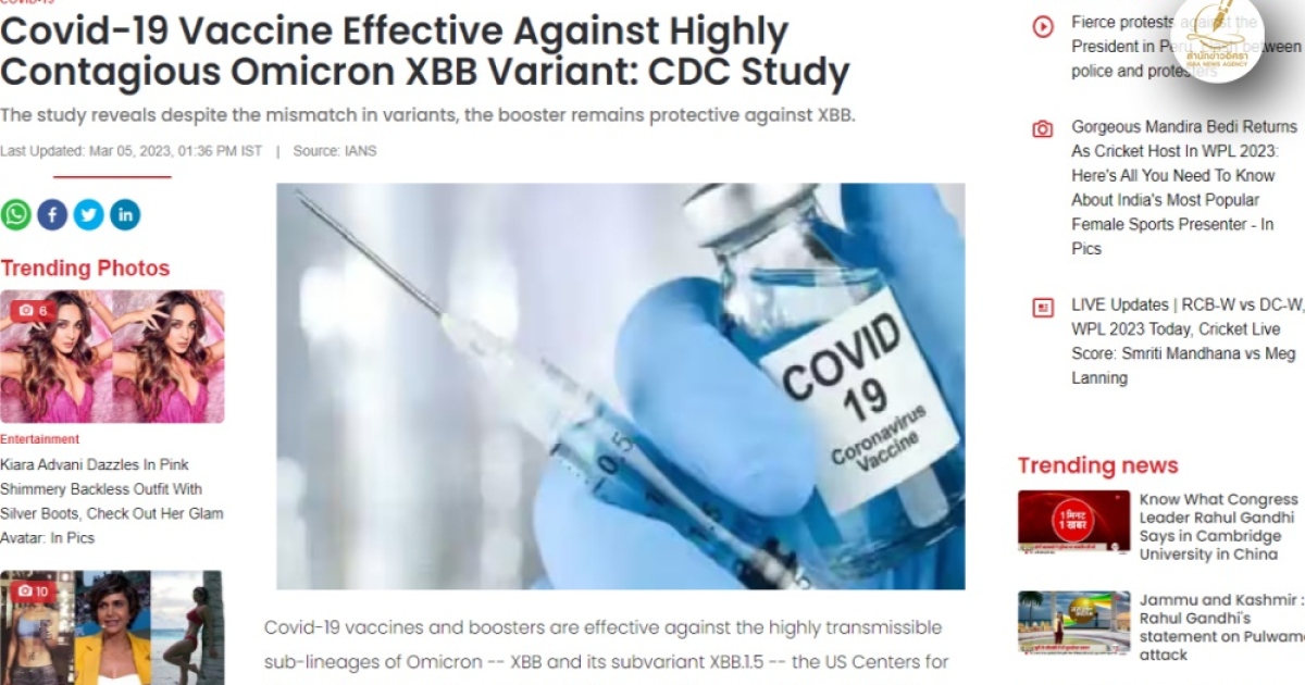 สำนักข่าวอิศรา (www.isranews.org) รายงานข่าวเกี่ยวกับสถานการณ์ของไวรัสโควิด-19 ว่ามีรายงานจากศูนย์ควบคุมโรคติดต่อสหรัฐอเมริกาหรือ CDC ระบุว่าการฉีดวัคซีนป้องกันโควิดและวัคซีนบูสเตอร์นั้นถือว่ามีประสิทธิภาพสูงมากในการป้องกันโควิดสายพันธุ์ย่อยโอไมครอนต่างๆที่ถือว่ามีศักยภาพในการแพร่เชื้อสูง ในขณะที่โอไมครอนสายพันธุ์ย่อย XBB.1.5 ที่เคยปรากฎตัวครั้งแรกเมื่อเดือน ส.ค.นั้นพบว่าตอนนี้ครองส่วนแบ่งการระบาดในสหรัฐฯไปแล้วถึง 90 เปอร์เซ็นต์