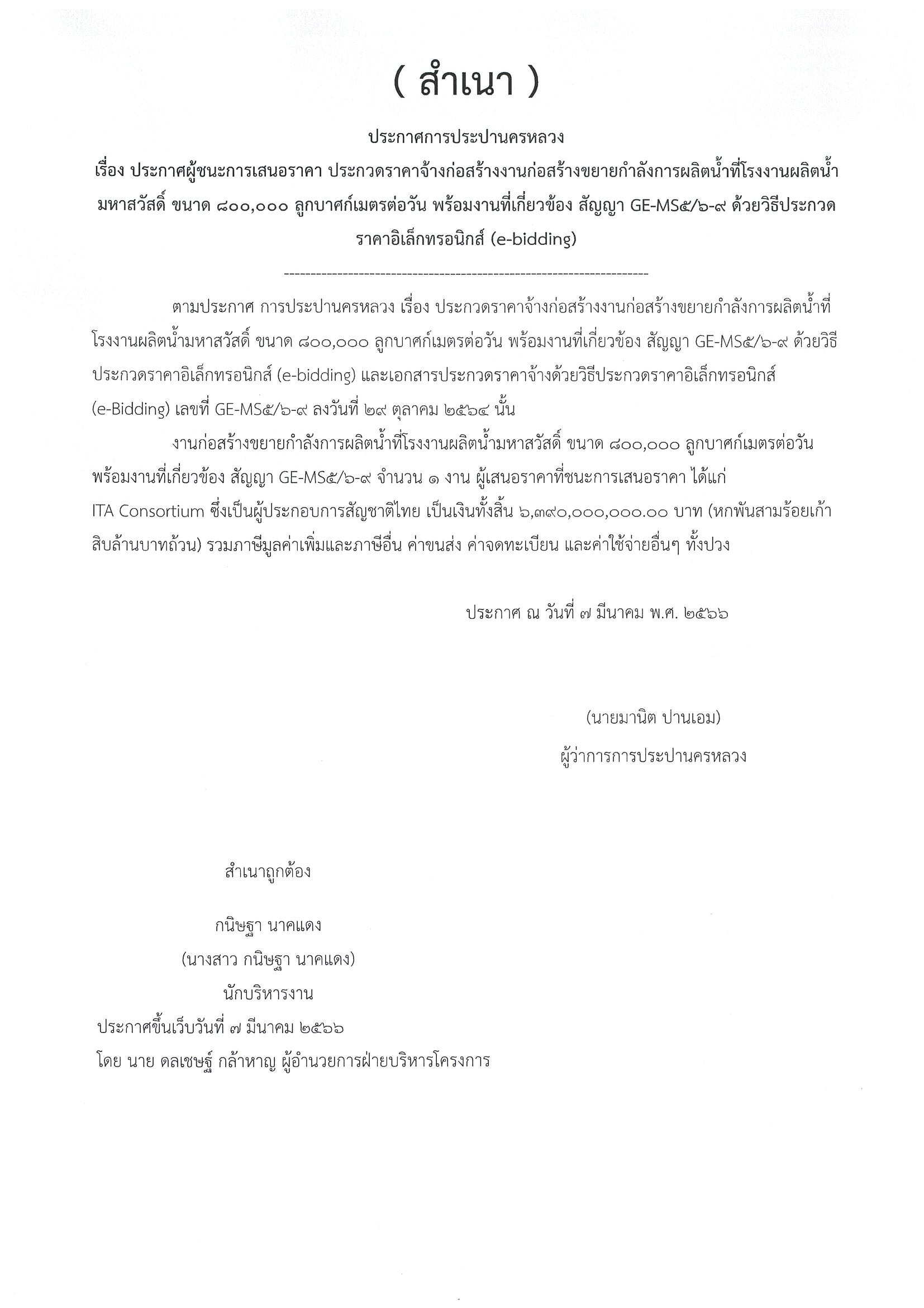 สำนักข่าวอิศรา (www.isranews.org) รายงานว่า เมื่อวันที่ 7 มี.ค. การประปานครหลวง (กปน.) ได้เผยแพร่ประกาศการประปานครหลวง เรื่อง ประกาศผู้ชนะการเสนอราคา ประกวดราคาจ้างก่อสร้างงานก่อสร้างขยายกำลังการผลิตน้ำที่โรงงานผลิตน้ำมหาสวัสดิ์ ขนาด 800,000 ลูกบาศก์เมตรต่อวัน พร้อมงานที่เกี่ยวข้อง สัญญา GE-MS5/6-9 ด้วยวิธีประกวดราคาอิเล็กทรอนิกส์ (e-bidding) โดยมีเนื้อหาว่า