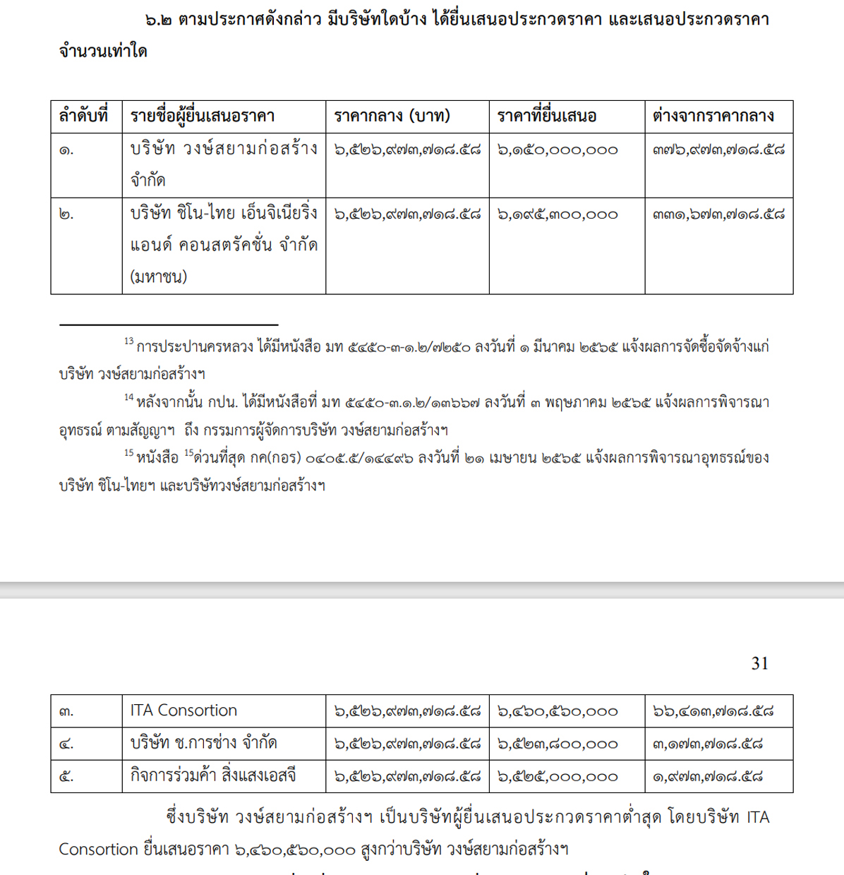 ส่วนบริษัท วงษ์สยามก่อสร้าง จำกัด ซึ่งผู้ยื่นเสนอประกวดราคาต่ำสุดที่ 6,150 ล้านบาท และต่ำกว่าราคาที่ ITA Consortium เสนอ 240 ล้านบาท นั้น กปน.แจ้งว่า บริษัท วงษ์สยามก่อสร้างฯ ไม่ผ่านการพิจารณา เพราะไม่ได้ปฏิบัติตามเงื่อนไขในประกาศและเอกสารประกวดราคาจ้างก่อสร้างงานก่อสร้างขยายกำลังการผลิตน้ำที่โรงงานผลิตน้ำมหาสวัสดิ์ ขนาด 800,000 ลูกบาศก์เมตรต่อวัน พร้อมงานที่เกี่ยวข้อง สัญญา GE-MS5/6-9 ด้วยวิธีประกวดราคาอิเล็กทรอนิกส์ ได้แก่