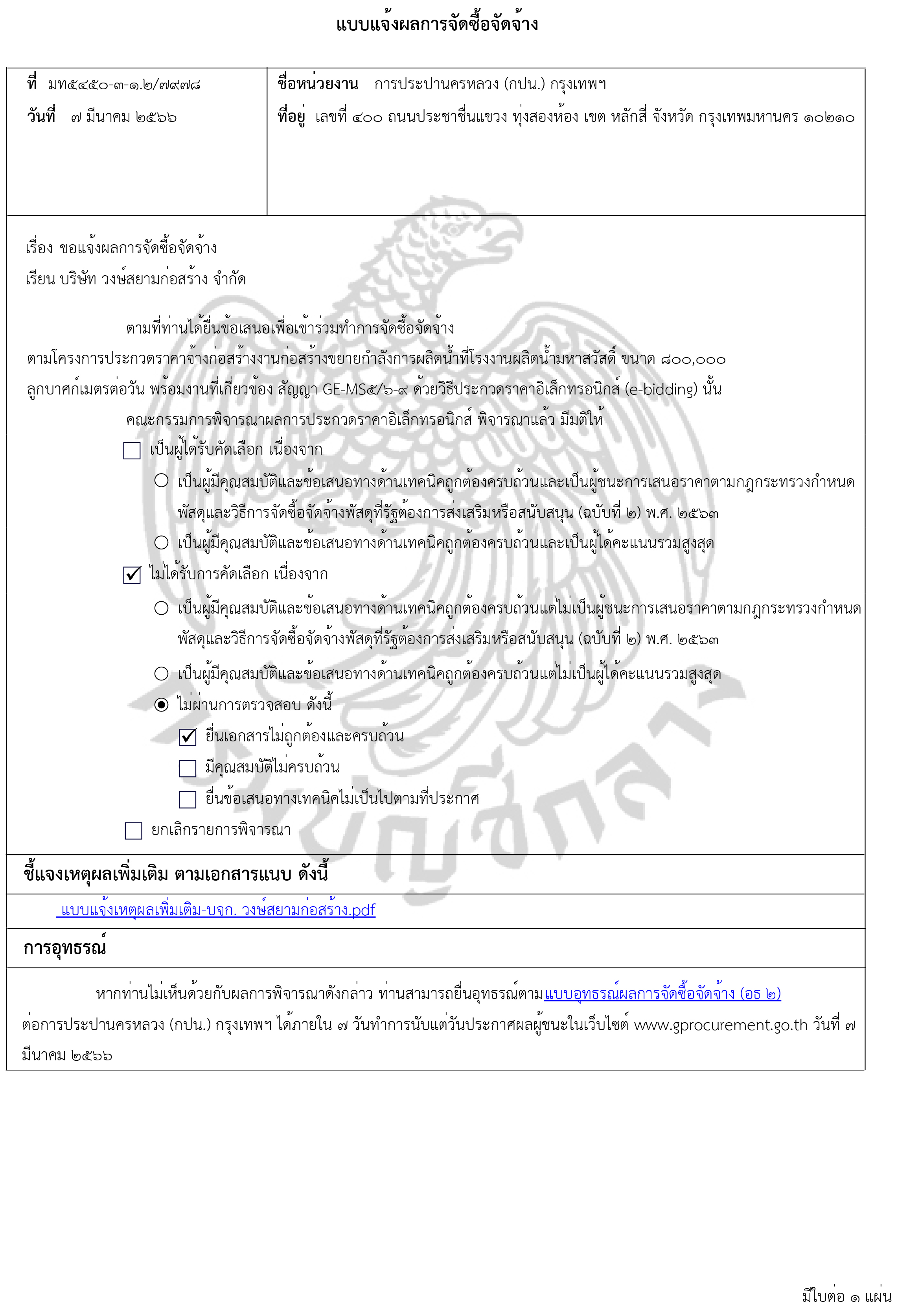 เช่น บริษัท วงษ์สยามก่อสร้างฯ ยื่นข้อเสนอเอกสารแสดงประสิทธิภาพของเครื่องจักรและอุปกรณ์ภาคผนวก “ช” ในส่วนที่เป็นสาระสําคัญตามขอบเขตงานและรายละเอียดคุณลักษณะเฉพาะของพัสดุ ไม่เป็นไปตามเงื่อนไขที่การประปานครหลวงกําหนด ตามเอกสารประกวดราคา เล่ม 2/8 ใบเสนอราคาและเอกสารแนบท้าย (Form of Bids and Bill of Quantities) และเอกสารประกวดราคา เล่ม 6/8 รายการละเอียดประกอบแบบเพิ่มเติม (Supplemental Specification) เป็นต้น