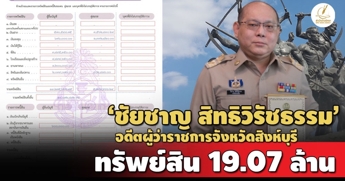 ป.ป.ช. เปิดบัญชีทรัพย์สิน 'ชัยชาญ สิทธิวิรัชธรรม' กรณีพ้นตำแหน่งผู้ว่าราชการจังหวัดสิงห์บุรี ทรัพย์สินกว่า 19 ล้าน รายได้ 1.4 ล้านต่อปี