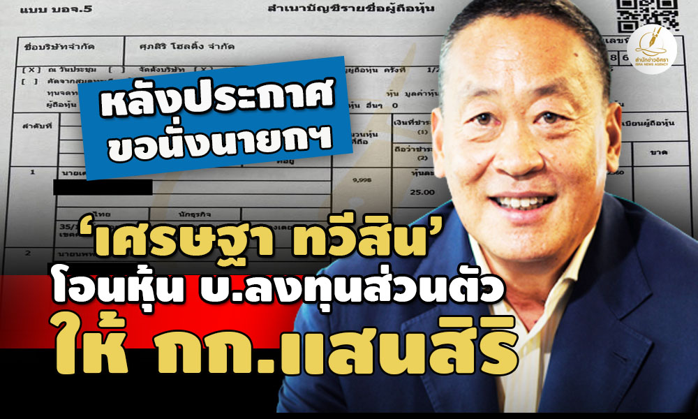 กรณี สำนักข่าวอิศรา (www.isranews.org) ตรวจสอบพบว่า เมื่อวันที่ 3 มี.ค.2566 นายเศรษฐา ทวีสิน นักธุรกิจอสังหาริมทรัพย์ ประธานอำนวยการและกรรมการผู้จัดการใหญ่ บริษัท แสนสิริ จำกัด (มหาชน) ประธานที่ปรึกษาด้านเศรษฐกิจ และหัวครอบครัวพรรคเพื่อไทย ได้โอนหุ้น บริษัท ศุภสิริ โฮลดิ้ง จำกัด ซึ่งเป็นธุรกิจลงทุนในบริษัทอื่น จำนวน 9,998 หุ้น ไปให้ นายนพพร บุญถนอม กรรมการบริหาร บริษัท แสนสิริ จำกัด (มหาชน) ทั้งหมด