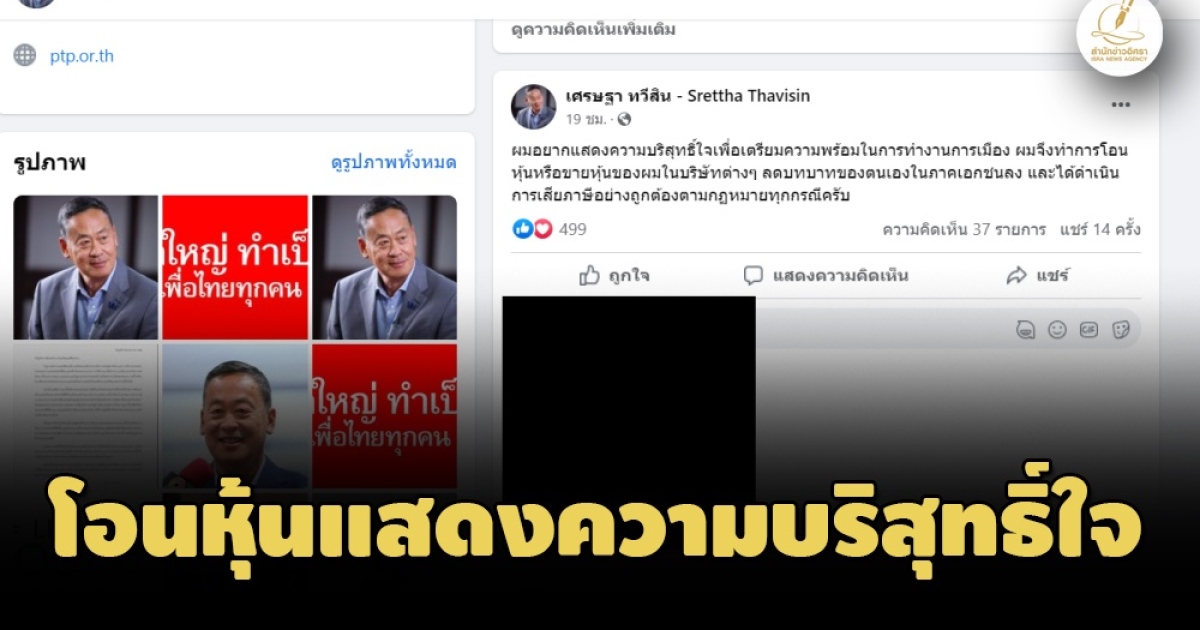 'เศรษฐา ทวีสิน' ประกาศแสดงความบริสุทธิ์ใจลงเล่นการเมือง ขอโอนหุ้นเอกชนทุกบริษัท ล่าสุดพบเพิ่งโอนหุ้นแสนศิริ 661 ล้านหุ้นให้ลูกสาวเมื่อ 8 มี.ค. คิดเป็นสัดส่วน 4.4 เปอร์เซ็นต์
