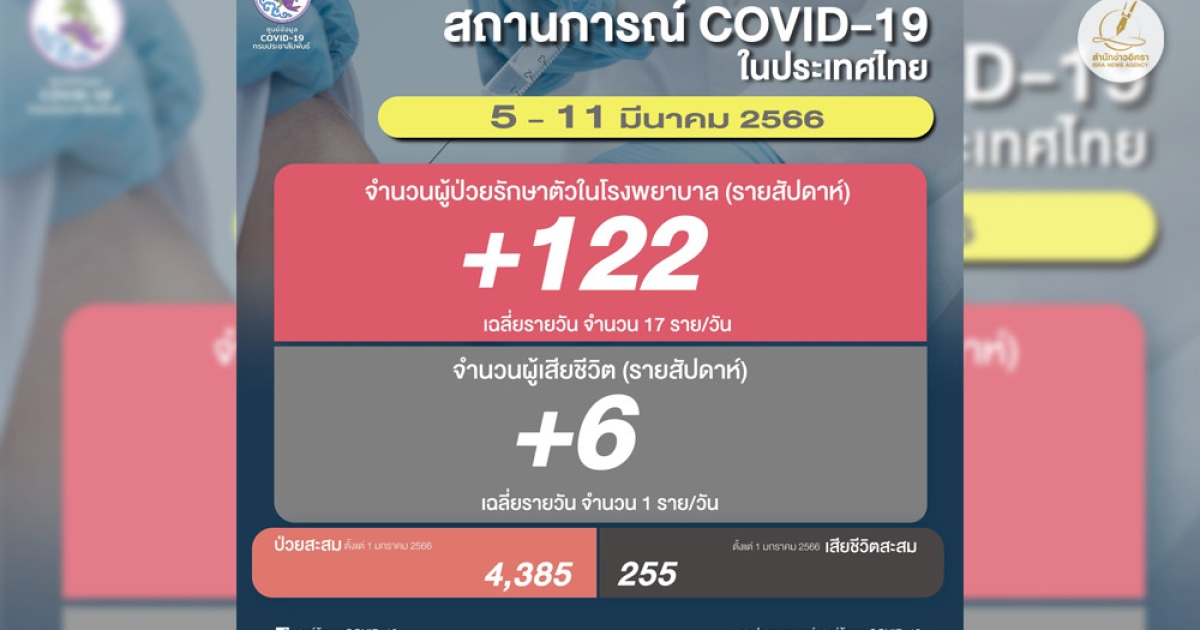 สถานการณ์โควิดไทย สัปดาห์ล่าสุด 5 - 11 มี.ค. 2566 ติดเชื้อเข้ารักษาใน รพ.ใหม่ 122 ราย เฉลี่ย 17/วัน เสียชีวิต 6 ราย เฉลี่ย 1/วัน อาการหนัก 46 ราย