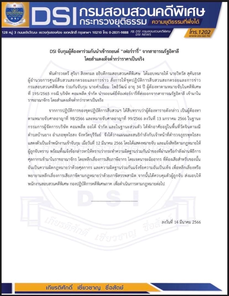 กรมสอบสวนคดีพิเศษตามจับ กก.บ.คอมพลีต ฯ ผู้ต้องหานำเข้ารถยนต์ 'เฟอร์รารี่' จากประเทศอิตาลี สำแดงราคาเท็จต่ำกว่าความจริง พักอาศัยในพื้นที่วัด จ.บุรีรัมย์