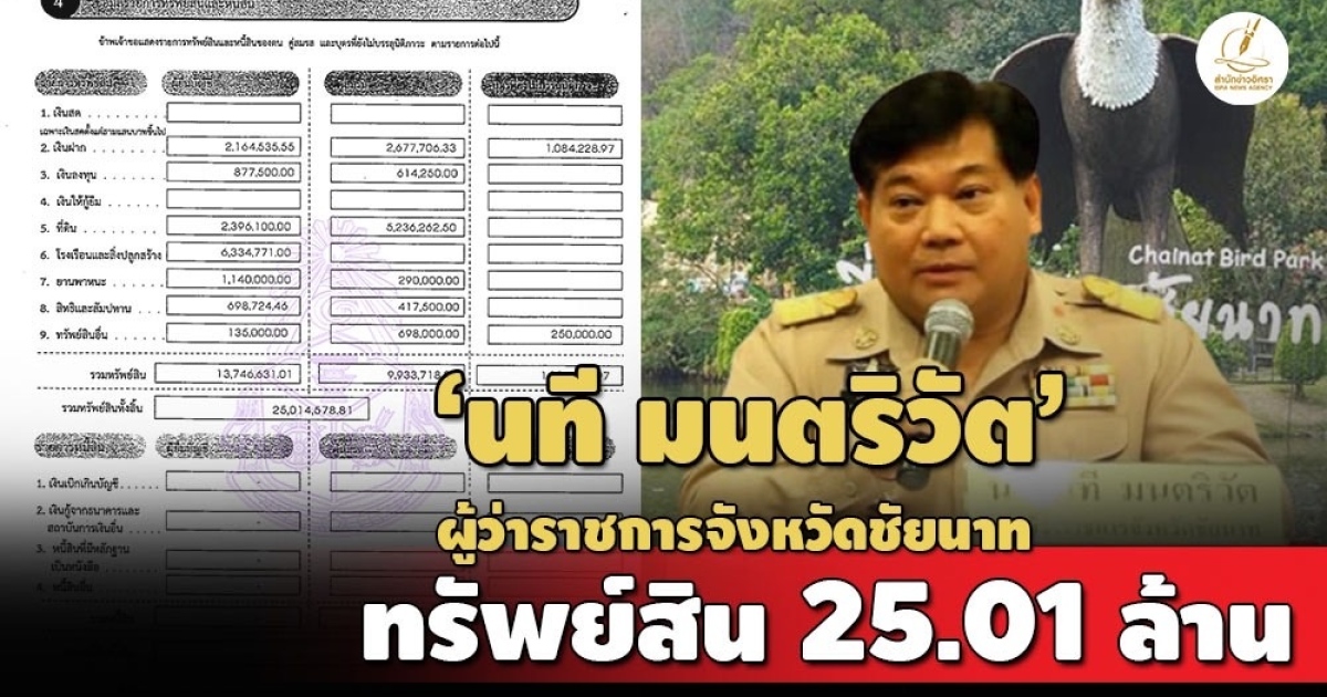 ป.ป.ช. เปิดบัญชีทรัพย์สิน นที มนตริวัต กรณีเข้ารับตำแหน่ง ผู้ว่าราชการจังหวัดชัยนาท ทรัพย์สินกว่า 25 ล. มีห้องชุด 3 ห้องที่ดอนเมือง-บางพลัด-บางกอกน้อย มูลค่ารวมกว่า 5 ล. รายได้ 1.4 ล./ปี สะสมแหวนทองคำ-พระเครื่อง ภรรยามีสร้อยคอทองคำ 11 เส้น ส่วนบุตรมีตลับพระ/จี้ทองคำ 8 ชิ้น